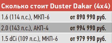 Представленный на этих страницах Duster Dakar – 2016 года выпуска. Этот экземпляр, помимо прочего, снабжен камерой заднего вида и задним парктроником. А вот в прайс-листе обновленной спецверсии 2017 модельного года такого оборудования не значится – его можно получить «по умолчанию» на топ-версии обычного Duster или заказать в пакете опций для него же в исполнении Privilege, стоящем на ступень ниже. В целом же по насыщенности различными «удобствами» Dakar близок именно к ней: те же тканевые сиденья и окрашенные в цвет кузова зеркала, но черные диски с полированными кромками от старшего Duster. Если вы уже 5 лет искренне считаете окрашенные под хром зеркала на недорогом французском кроссовере чем-то вызывающе неуместным, а выделиться все равно хочется, Dakar – самое то.