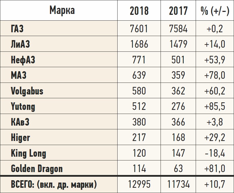 Объем российского рынка новых автобусов по итогам 2018 года увеличился до 13 тыс. – рост на 10,7%. Лидирует по-прежнему ПАЗ – 60% от общего объема продаж. За ним следуют ЛиАЗ и НефАЗ. Самой популярной моделью остается автобус малого класса ПАЗ-3205 (3755 ед., +11%). На втором и третьем местах также располагаются представители Павловского автобусного завода – малого класса ПАЗ-3204 (2532 шт., +1%) и высокопольный среднего класса ПАЗ-4234 (855 шт., -2%). Замыкают пятерку лидеров низкопольные НефАЗ-5299 (771 шт., +54%) и ЛиАЗ-5292 (719 шт., +4%).