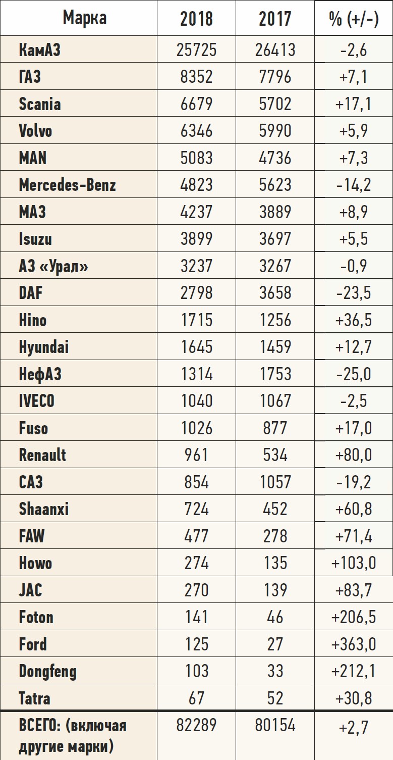 Аналитическое агентство «Автостат» сообщает, что объем рынка новых грузовых автомобилей по итогам минувшего года составил 82,3 тыс. единиц, что на 2,7% выше показателя 2017 года. Традиционный лидер – КамАЗ, на его долю пришлось свыше 30% от общего объема рынка. На втором месте расположился ГАЗ с 8,4 тыс. проданных автомобилей (+7,1%). Далее следуют шведские Scania (6,7 тыс. шт.) и Volvo (6,3 тыс. шт.). Замкнул первую пятерку немецкий MAN c результатом 5,1 тыс. грузовиков (+7,3%). Самые большие: рост у Scania (+17,1%), а падение – у DAF (-23,5%).