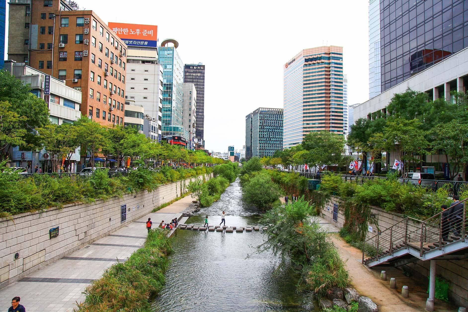 Далее мы направились к началу ручья Чхонгечхон. Сейчас это любимое место отдыха местных жителей и гостей города. Сложно себе представить, но с 1960-х годов ручей был скрыт под асфальтом огромной автомагистрали, которая, разумеется, влияла на экологию района совершенно не в лучшую сторону. В 2005 году завершился процесс реконструкции, превративший самые настоящие бетонные джунгли в оазис зелени: вытянутый в линию ландшафтный парк в самом центре мегаполиса, по которому можно гулять вдоль воды, любоваться многочисленными фонтанами и разнообразными мостиками. Таким преображением город показал, как надо заботиться об окружающей среде