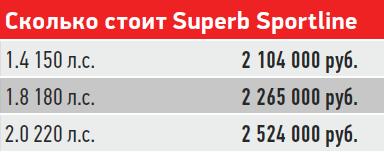 Естественно, включен в цену и стайлинг, по которому Superb Sportline, если он не золотого, конечно, цвета, можно отличить от обычного. Это черные решетка радиатора, зеркала, молдинги по периметру остекления и спойлер на крыше багажника, тонированная оптика да особые колесные диски.