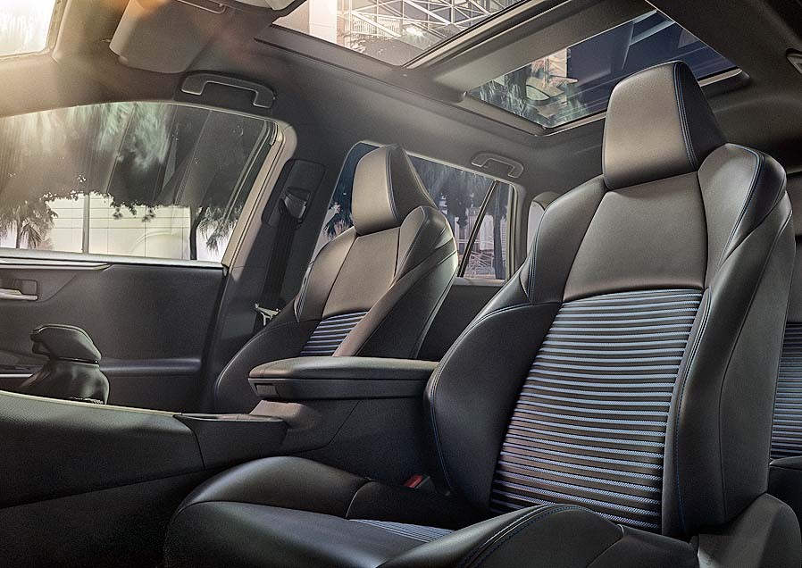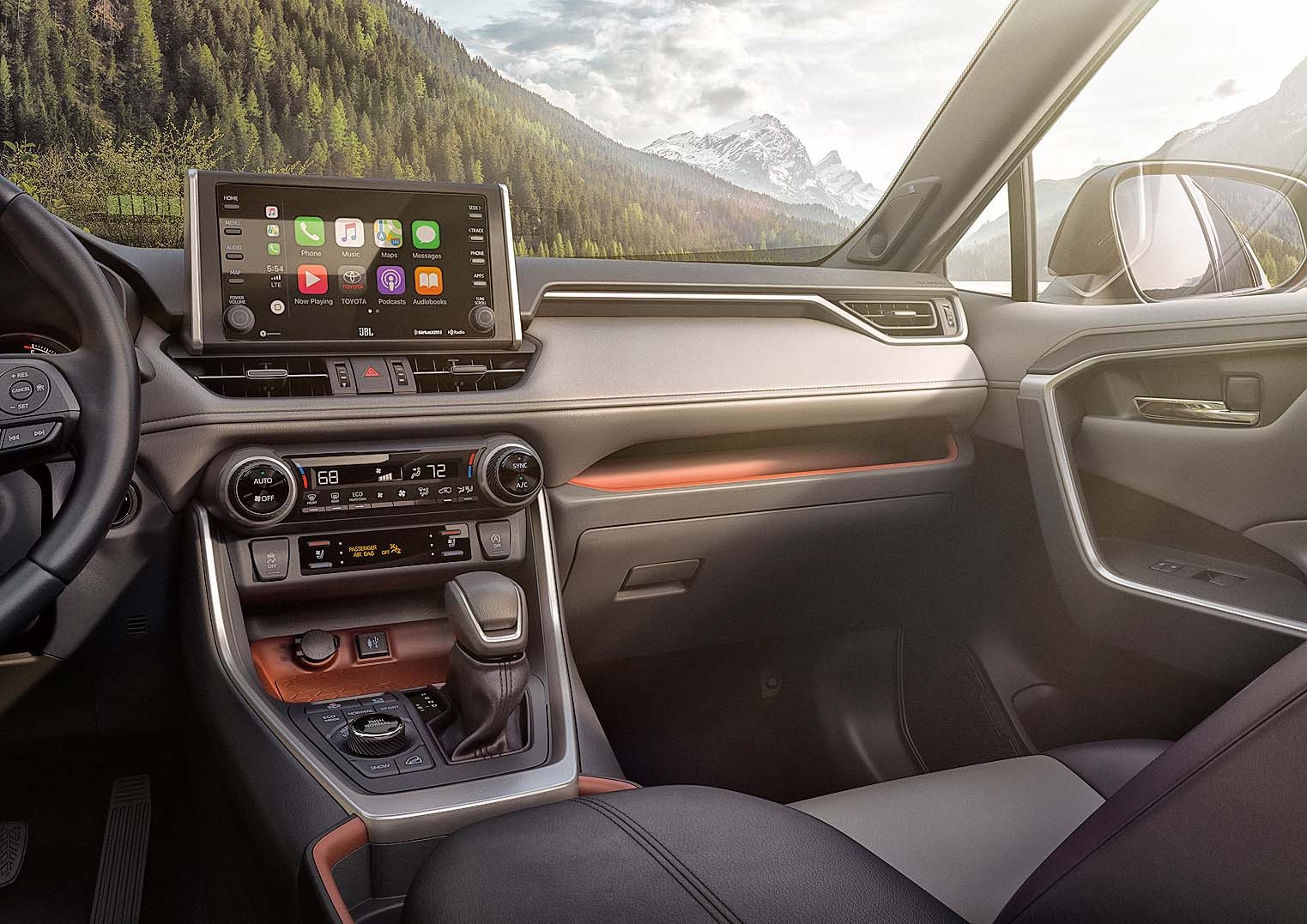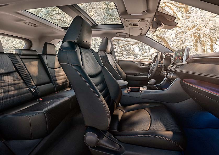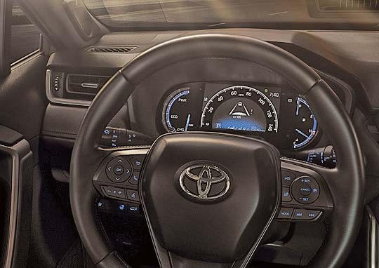 Внешность RAV4 изменилась радикально: кроссовер стал более брутальным, что должно привлечь в ряды покупателей мужчин среднего возраста. Интерьер тоже преобразился, но сохранил знакомую по предыдущему поколению машины архитектуру. Центральное место в ней занимает дисплей мультимедийной системы, возвышающийся над центральной консолью. Его размер варьируется в зависимости от комплектации автомобиля. Еще один экран – на щитке приборов, его окружают традиционного вида тахометр и спидометр. Сохранилась и традиционная для автомобилей Toyota синяя подсветка клавиш.