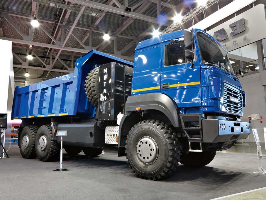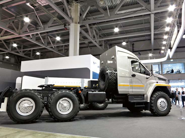 Главной премьерой автозавода «Урал» из города Миасс стал трехосный самосвал с колесной формулой 6х6 грузоподъемностью 18,5 тонн. Газовый двигатель Yuchai с искровым зажиганием развивает 420 л.с. Триста кубометров природного газа под давлением 200 бар размещаются в 17 балоннах. Запаса хватает на 600 км пути. Другая новинка – предсерийная премьера бескапотного удлиненного шасси (8х8) для установки крупногабаритных и тяжелых надстроек массой до 30 тонн. У него ярославский дизель мощностью 422 л.с. На демонстрировавшемся образце установлен цементировочный агрегат для обслуживания нефтескважин. Кроме того, были показаны два Ural Next. Cедельный тягач со спальной кабиной способен транспортировать на бездорожье полуприцеп массой до 30 тонн. И бортовой с КМУ и двойной семиместной кабиной для перевозки ремонтных бригад. У обоих 312-сильные дизели ЯМЗ.