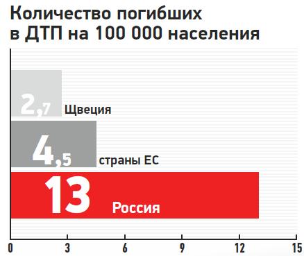 Чтобы сравнение стран было корректным, используется относительный показатель – тот самый социальный риск, характеризующий количество погибших в ДТП и от их последствий в пересчете на 100 тысяч человек населения. К слову, в Швеции сегодня он составляет 2,7, в среднем по странам Евросоюза – около 4,5, в то время как в России – порядка 13 погибших на 100 тысяч человек населения. Иными словами, реальный уровень смертности на дорогах в нашей стране почти в 3 раза выше, чем в Европе. Справедливости ради – и Европа, и Россия начинали целенаправленную работу по обузданию дорожной бойни примерно с одного уровня, когда социальный риск колебался на уровне 20. Только Старый Свет столкнулся с проблемой автомобилизации гораздо раньше – в 70-е годы прошлого века – и шел к сегодняшним показателям в течение 30–40 лет. Российский же премьер предложил сделать то же самое, но за 7 лет! Вроде бы время лозунгов из серии «пятилетку досрочно» уже давно кануло в Лету, но генетическая память, видимо, все же дает о себе знать.