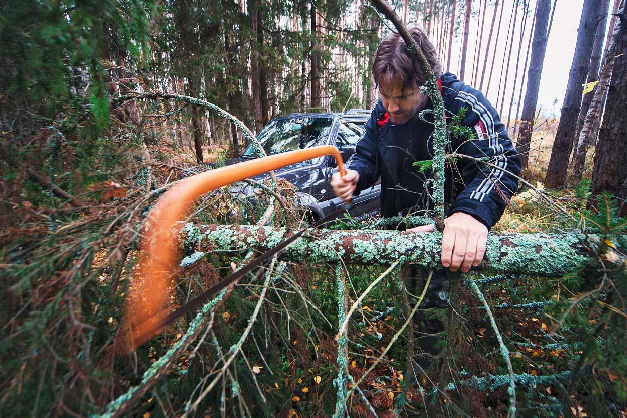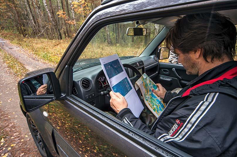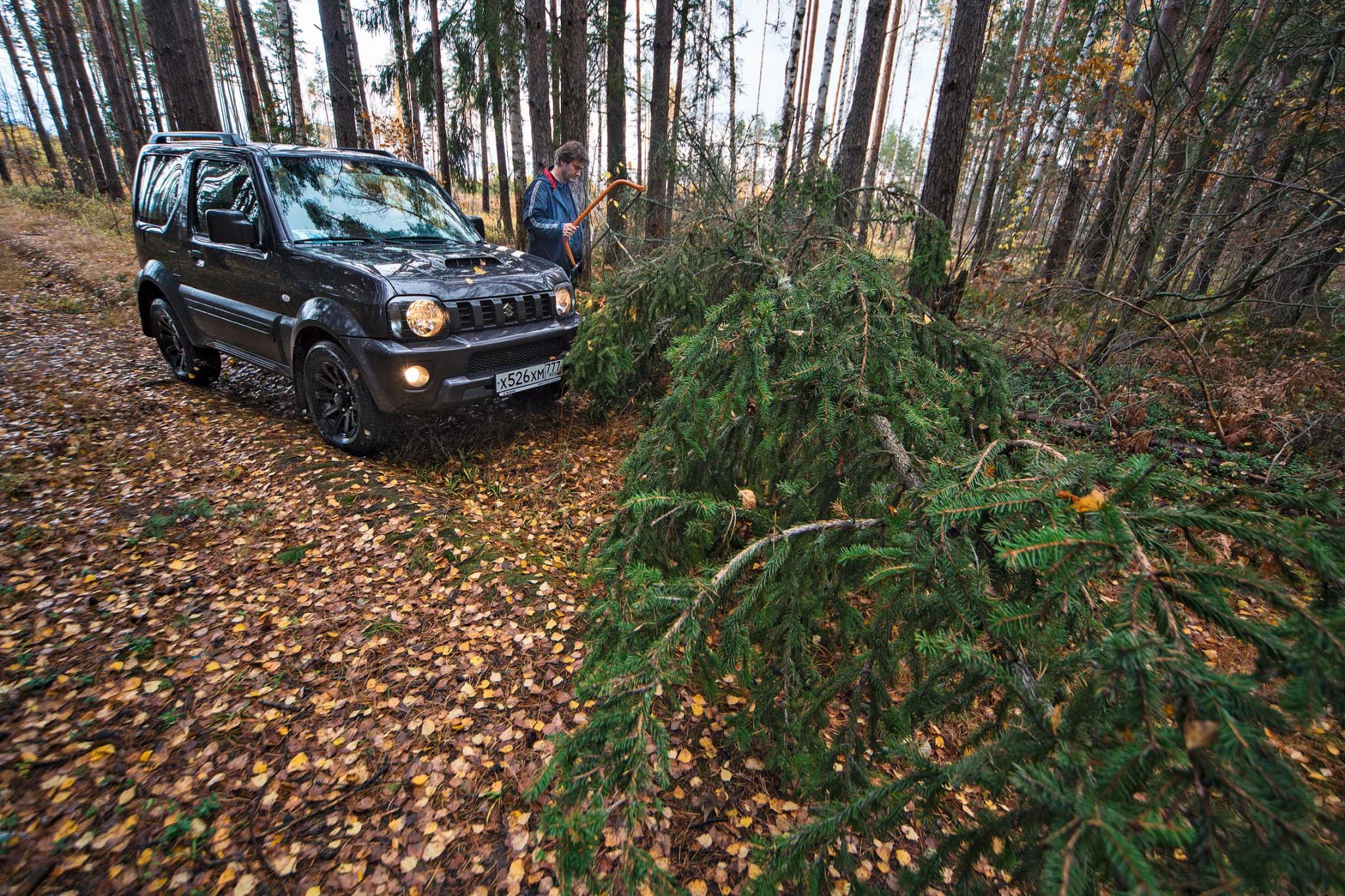 Похоже, лопату и рычажную лебедку тащил напрасно. Дорога накатана несмотря на страшилки в Интернете, называющие эти места гиблыми, и не прекращающиеся уже несколько дней дожди. Но определиться по карте не помешает. Несмотря на очень короткую базу кочки и ухабы Jimny преодолевает комфортно. Идет мягко. По сути, с весом в тонну ему и полный привод не нужен, пока не начнутся настоящие хляби. А болот здесь хватает. Название озера – Смердячее, кстати, идет от запаха сероводорода – выбросов болотного газа. В урочище, говорят, растут двухметровые папоротники и березы-мутанты с квадратными стволами. Пока растения встречаются обычные. Вот только елка, еще зеленая, каким-то чудом завалилась поперек дороги. Не зря пилу прихватил. К слову, Jimny узенький – кей-кар чистой воды, мог бы и так протиснуться.