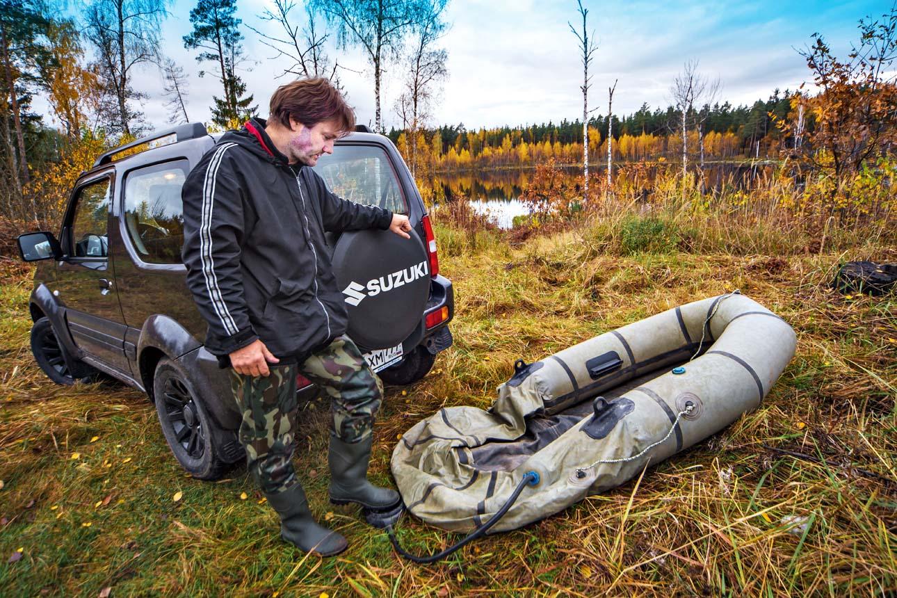 Все что не касается Jimny у меня вызывает опасение. Хорошо, что старенькая лодка, живущая в неотапливаемом гараже, еще держит давление. Следом за мной на озеро приехали джиперы на лифтованной отечественной технике. Наговорили моему глазастику массу комплиментов. Спросили положенное: сколько прет, сколько жрет. И, получив неутешительный для своей техники ответ, расстроенные укатили воевать с местными болотами. Мне же, пока светло, еще нужно промерить эхолотом глубины.