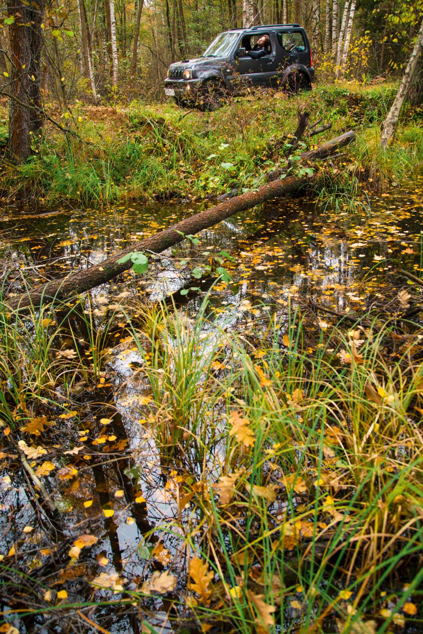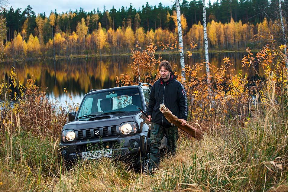 Озеро и правда идеально круглой формы. Вокруг некий грунтовый поросший лесом отвал, будто в середину действительно угодил метеорит и разбросал землю вокруг. Метеорит долго искали. Говорят, пока не нашли. Поищем и мы, может компас на воде покажет магнитные аномалии? Jimny, как и положено полноценному внедорожнику, довез до кромки воды. Почти полное отсутствие свесов и короткая база позволяют штурмовать чуть ли не отвесные стены и эффективно преодолевать распутицу.