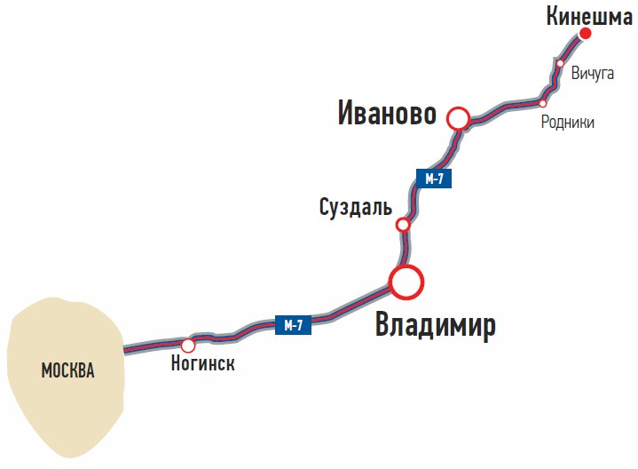 Чтобы доехать из Москвы до Кинешмы (400 км от МКАД), сначала нужно добраться до Иваново – по трассе М-7 «Волга». Маршрут проходит через Владимир и Суздаль, так что по пути можно посмотреть и эти города. На данном участке дорожное покрытие отличное. От Иваново до Кинешмы ведет автодорога P-71. Здесь состояние асфальта меняется, встречаются ямы, неровные заплатки. Приходится быть очень внимательным