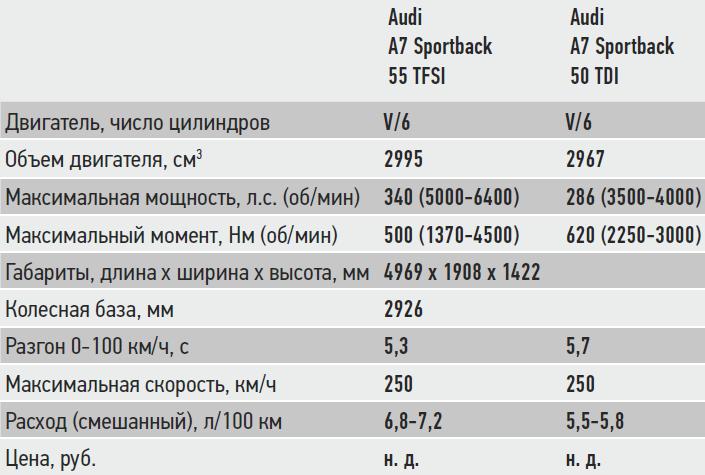К старту продаж в Европе немцы приготовили две модификации Audi A7 Sportback – бензиновую с отдачей 340 л.с. и дизельную мощностью 286 л.с. В Россию вначале (заказы принимать начнут летом) привезут версию 55 TFSI. Лифтбэк 50 TDI появится у нас немного позже. Все версии получили технологию «умеренного гибрида» MHEV, в основе которой бортовая электросеть напряжением 48 В и стартер-генератор с ременным приводом. Производитель обещает, что нововведение позволит экономить 0,7 л топлива на 100 км пути и сделает купе более комфортным.