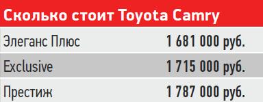 У «Лексуса» есть похожий металлик. Но что-то мне подсказывает, такой экстравагантный прикид для Camry выберут единицы. Так ведь гамму монохромных цветов никто не отменял. И на случай неприятия клиентом новой физиономии машины, японцы продумали соответствующие меры. Осталось пять комплектаций – «Комфорт», «Элеганс», «Стандарт», «Стандарт Плюс» и «КласСколько стоит Toyota Camry Элеганс Плюс 1 681 000 руб. Exclusive 1 715 000 руб. Престиж 1 787 000 руб. Многофункциональная приборная панель с оптитронной голубой подсветкой шкал и цветным дисплеем бортового компьютера – базовое оснащение японского седана Для пользования интернет сервисами медиасистемы версии Exclusive дилеры продают и устанавливают 3G модули со специальным тарифом и трехмесячной бесплатной подпиской сик», – которые рестайлинг практически не зацепил. Антенна-плавничок «ЭРА-Глонасс» на крыше, и светодиодные «противотуманки» – вот короткий и полный список их приобретений. И главное – ценник на прежнем уровне. Что может быть лучше этой новости?