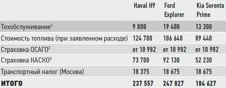 У каждого из этих трех автомобилей есть свои сильные и слабые стороны. Haval H9 берет вместительностью, оснащением, внедорожными возможностями и ценой. Ford Explorer вдобавок готов предложить «богатый» интерьер и статусную внешность. Kia Sorento Prime оказался самым маленьким среди конкурентов. Но при этом он остается на удивление вместительным. Главный же его плюс – лучшая управляемость и динамика.