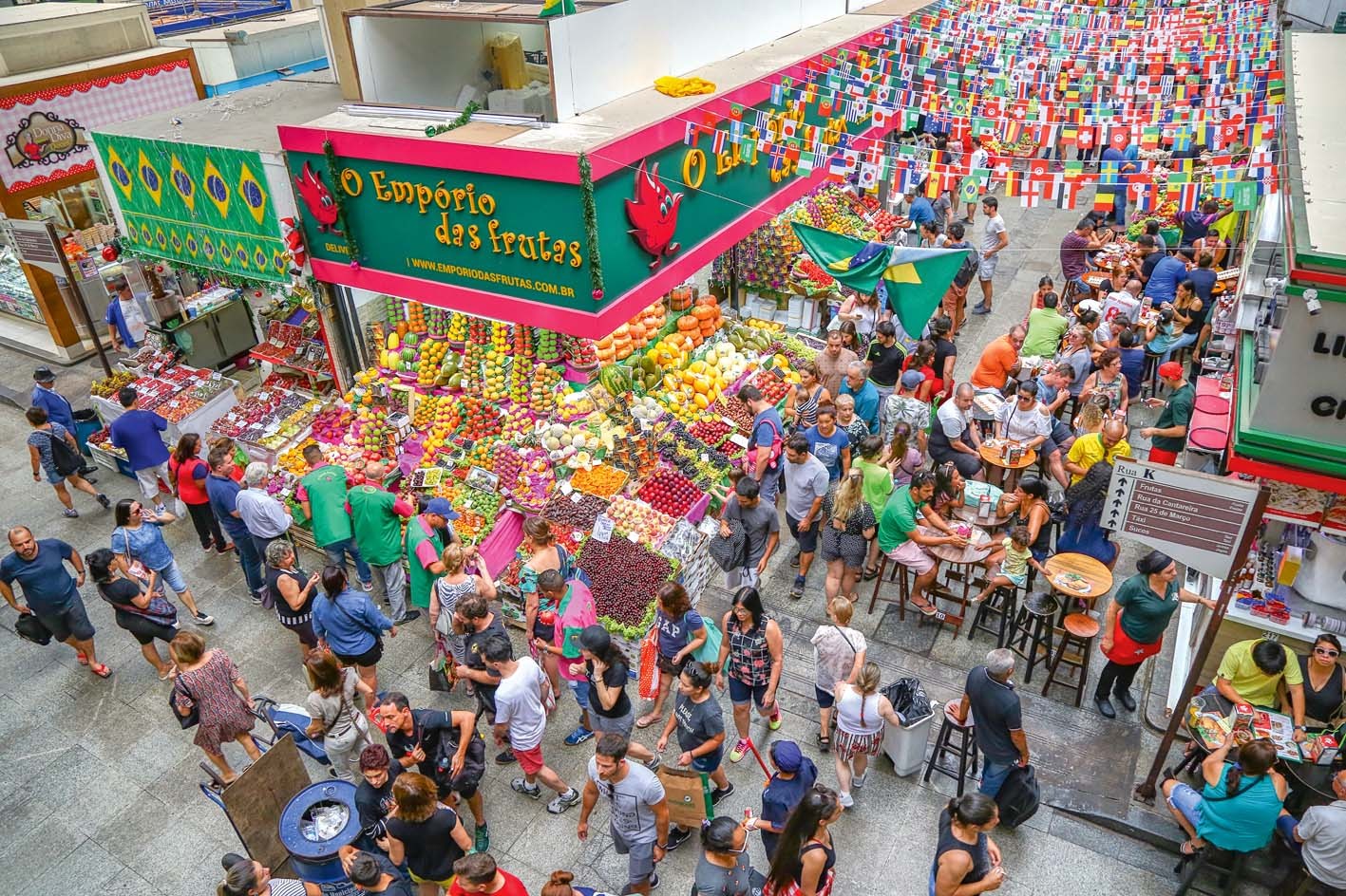 Отсюда буквально 10 минут пешком до главной смотровой площадки города. Здание, построенное в 1947-м, было в то время самым высоким небоскребом за пределами США (его высота 161,22 м) и до 1960 года удерживало звание самого высокого здания в Южной Америке. Оно несколько раз переименовывалось (Banespa, Altino Arantes), а сейчас носит название Farol Santander. Со смотровой открывается завораживающая панорама города. Вход платный, есть небольшая очередь. Еще 10 минут пешком – и вы у знаменитого продуктового муниципального рынка, а весь путь до него – это настоящее сумасшествие с толпами народа, магазинами китайских товаров и каких-то безделушек.