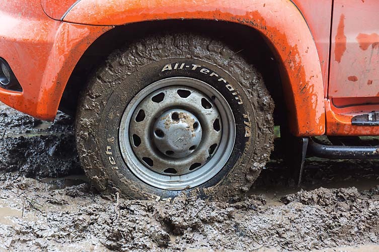 Нет, таких гиблых мест, которые приходится преодолевать исключительно «на лебедке», нам по пути не попалось – ее мы использовали пару раз скорее в исследовательских целях. Справляется она со своими обязанностями исправно, а длины провода пульта управления хватает на то, чтобы управлять лебедкой из кабины – случись засесть не в компании единомышленников, и то не пропадем. А для преодоления большинства препятствий, даже весьма угрожающего вида, хватало возможностей штатных для экспедиционного «Патриота» грязевых шин BF Goodrich. Включаем «нижний» ряд в трансмиссии, вторую передачу – и автомобиль взбирается на очередной скользкий подъем. Пусть иногда не с первого раза – но с разгона уж точно. Бензиновый 2,7-литровый мотор мощностью 135 л.с. для тяжелого «Патриота», да в горной местности все-таки слабоват – просится мотор помощнее.