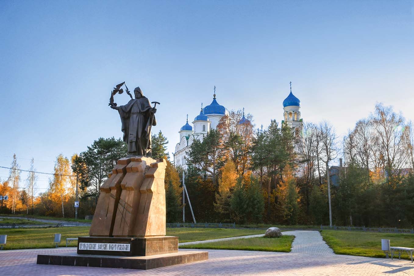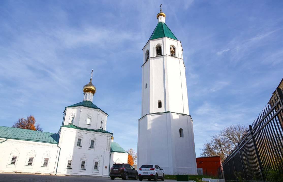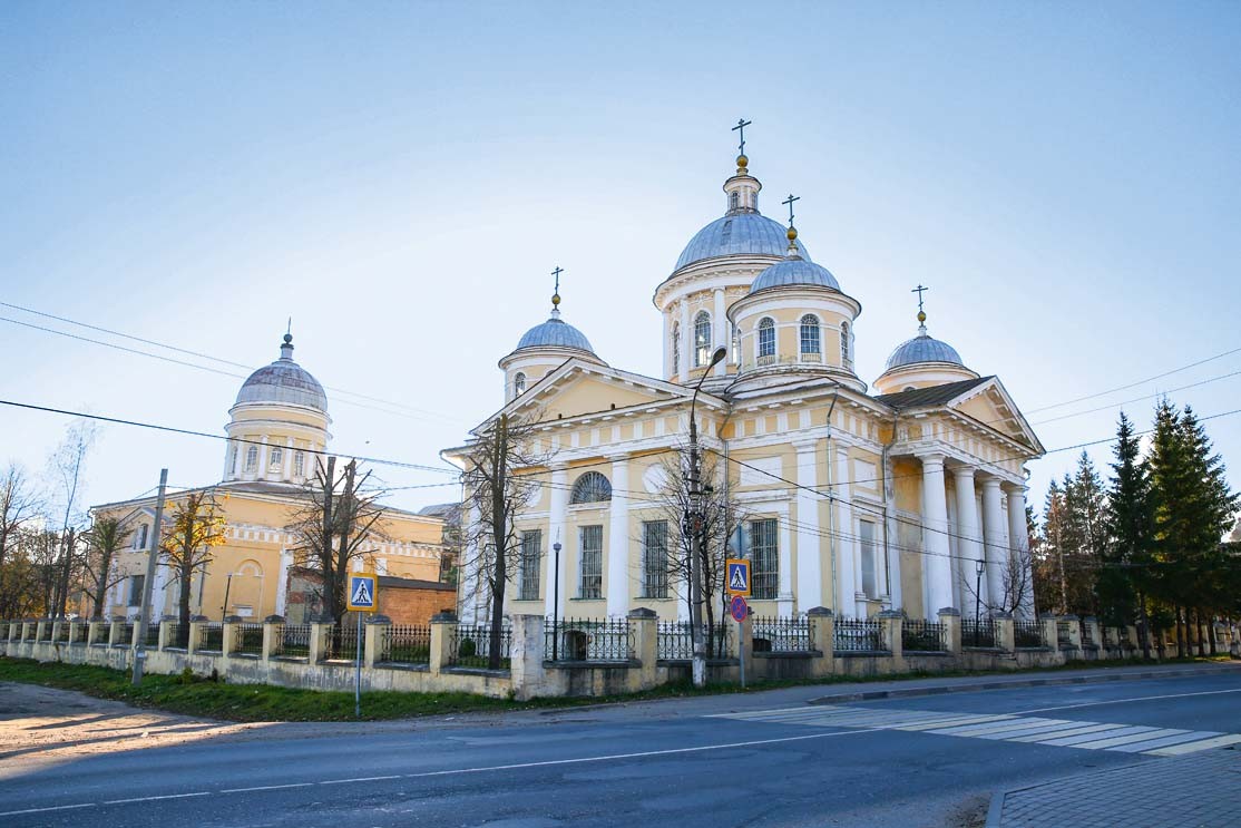 Центр – Советская площадь, сквер, памятники, симпатичные торговые ряды, а также соборный комплекс с непростой историей. Открыв карту, вы увидите, что здесь должен находиться Троицкий собор 1836 года, но ничего, даже издали похожего, нет. В послевоенные годы он был перестроен до неузнаваемости... в Дом Культуры! В планах обозначена реставрация. За зданием возвышается столп трехъярусной колокольни. Она старше собора и по архитектуре близка к образцам XVI века, рядом – бережно восстановленный Храм Воскресения Христова (XVIII век). Чтобы прогуляться по центру, машину пришлось оставить во дворах близлежащих домов, – кругом либо знаки, запрещающие парковку, либо банально нет мест.