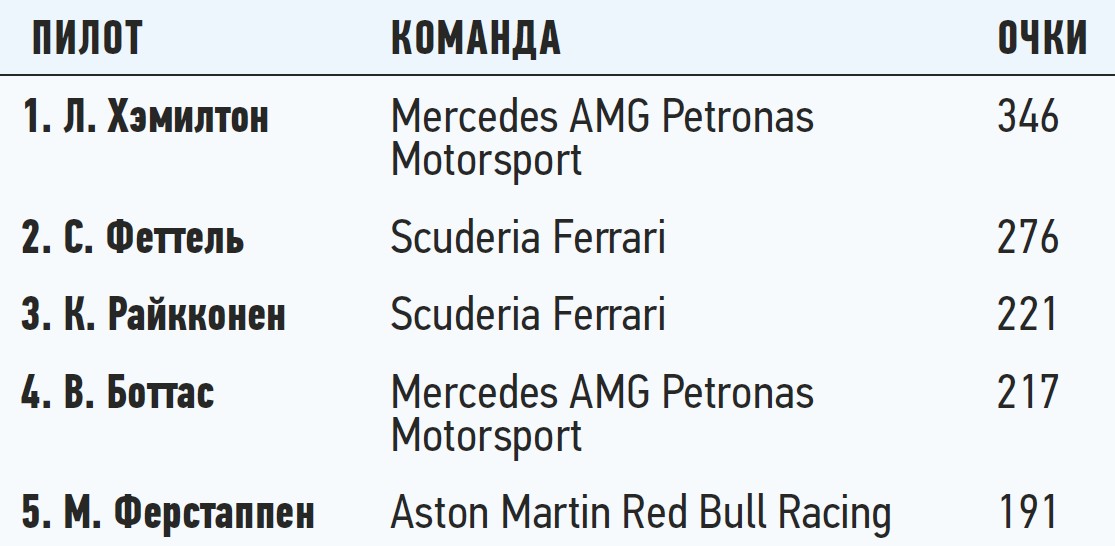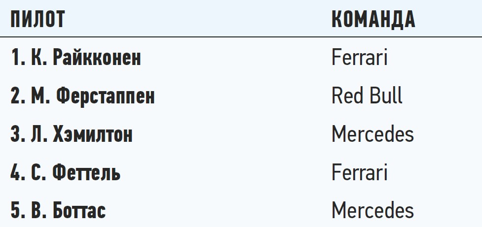 Победу одержал Кими Райкконен – первую за пять лет. Удачная стратегия Ferrari, упорная борьба Макса Ферстаппена из команды Red Bull и ошибка Mercedes сделали эту гонку очень интересной, а также отсрочили коронацию Льюиса званием пятикратного чемпиона мира – как минимум до следующей гонки.