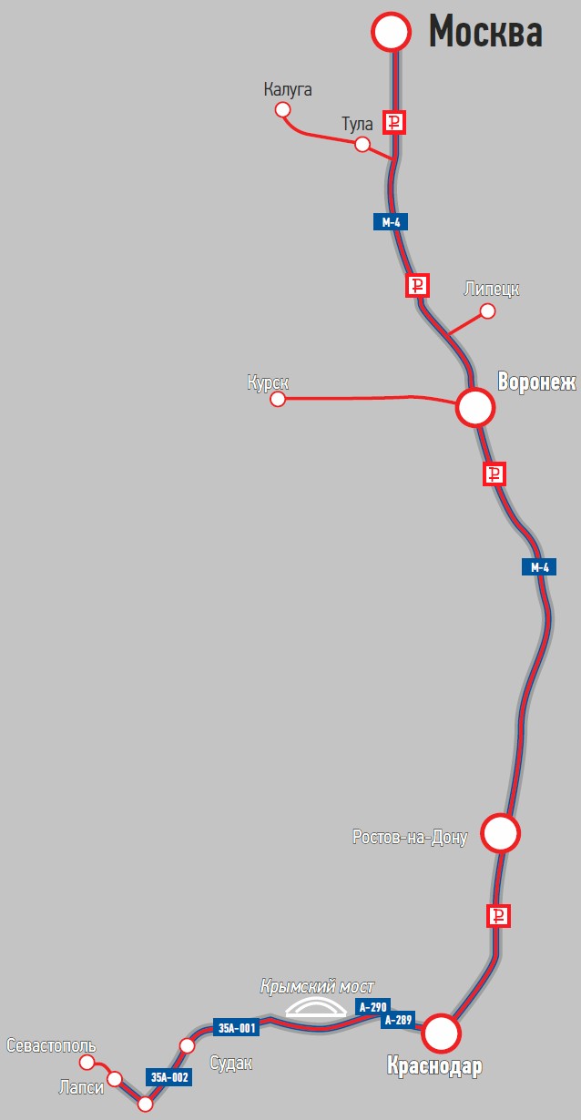 Главная дорога России к Черному морю – трасса М4 «Дон» – уже несколько лет платная. Перед поездкой стоит приобрести транспондер. При общей стоимости пути туда и обратно в 1600 рублей он позволит и сэкономить, и сократить время прохода пунктов взимания платы.