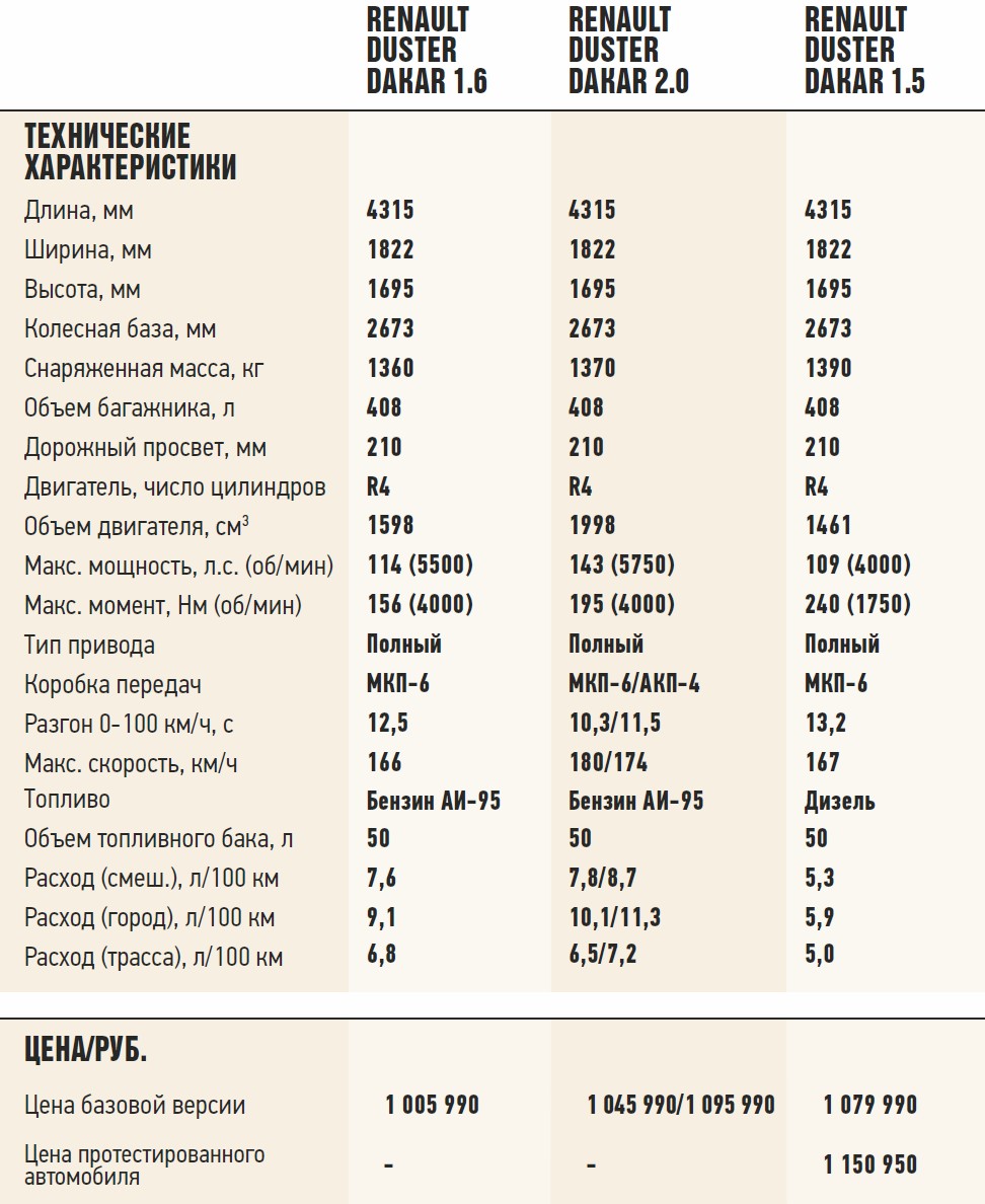 У всех Duster Dakar одинаковый набор оборудования, лишь два отличия есть у дизельных машин. Подогрев сидений, кондиционер, полноразмерная запаска – все уже «в базе». Доплатить можно за навигацию, камеру заднего вида, систему ESP