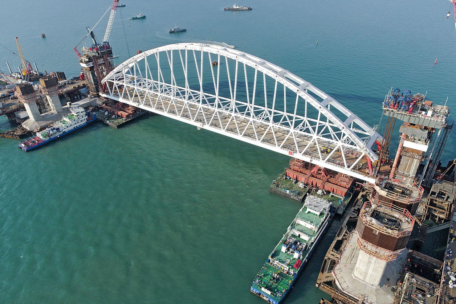 Пока мы с вами догуливали летние каникулы, строители Крымского моста тягали железо. В конце августа в Керченском проливе устанавливали железнодорожную арку моста. Ее высота – 45 метров, длина – 227 метров. Собранного на берегу исполина доставили в пролив из Керчи на плавучих опорах и, зафиксировав последние якорями, при помощи кранов подняли и водрузили на опоры на высоте 35 метров.