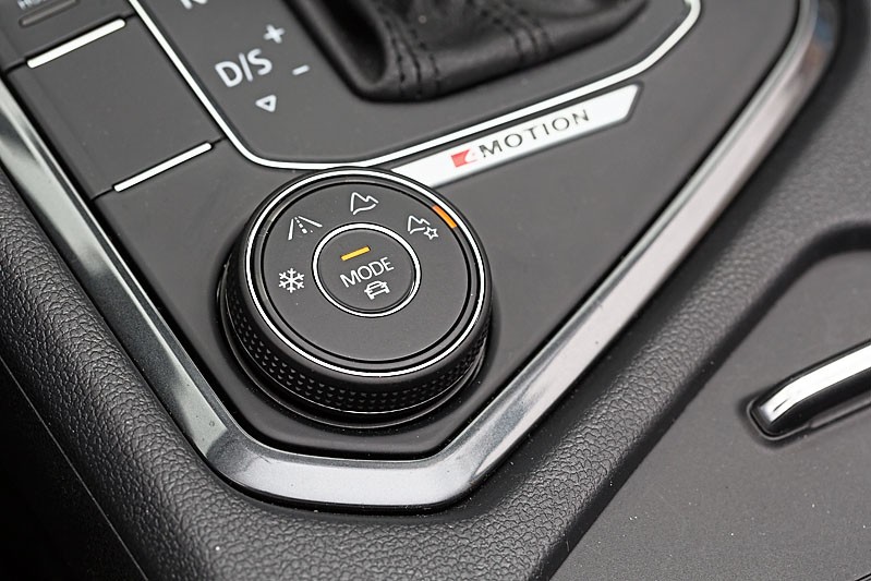 Ожидаемо у всех автомобилей в этой комплектации по умолчанию есть полный привод. При этом сама система ничем не отличается от 4Motion на других Tiguan. Поворачивая шайбу возле рычага КП, можно выбирать режим работы полного привода – есть программы и для движения по сухому асфальту, и для специфических дорожных условий – в том числе снега. Сверху на том же селекторе – кнопка выбора режима движения: предусмотрен экономичный, стандартный, спортивный, а также индивидуально настраиваемый.