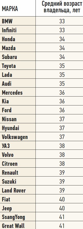 Так, оказалось, что самые молодые владельцы – у автомобилей BMW и Infinifi . Средний возраст россиян, которые ездят на разных моделях этих марок – 33 года. Самыми же старшими оказались владельцы машин SsangYong и Great Wall – им в среднем 41 год.