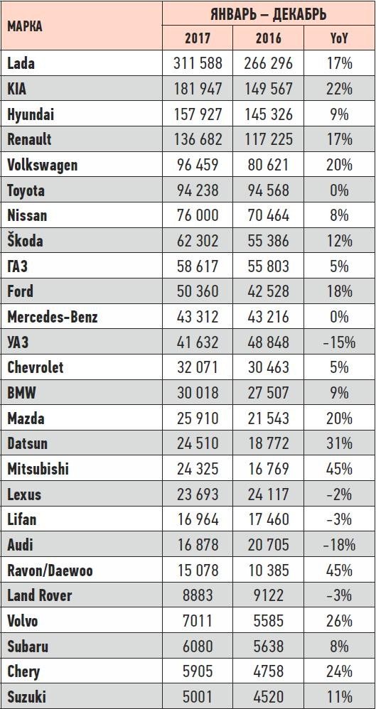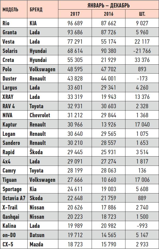 И все же разберемся, кто среди автопроизводителей на этот раз оказался в лидерах. В таблицах эта информация представлена более наглядно, но «словами» надежнее. Итак, Lada – уверенный лидер благодаря бойким продажам сразу нескольких моделей: Granta, Vesta, XRay и Kalina. Первые две из них вошли и в пятерку лучших бестселлеров года (2 и 3 места). Следом с изрядным отрывом встала Kia со своим главным бестселлером прошлого года – Rio. По итогам года это самая часто покупаемая модель в России. А вот Hyundai, обеспечив для Solaris и Creta сразу два места в пятерке бестселлеров, остался третьим в общем зачете. На четвертое место как обычно вырулила Renault, ее Logan и Duster в этом году изрядно претерпели от конкурентов. Если к легковушкам прибавить продажи коммерческих автомобилей, то пятерку замыкает Volkswagen. А на шестую строчку выкатилась Toyota. Любопытно, что в 2016-м они были пятыми, но японцам с позапрошлого года удалось сохранить за собой высокую долю рынка даже с нулевым ростом продаж, их тираж остался прежним. Постоянность – признак мастерства. И если бы Volkswagen не «стрельнул» вверх на 20%, статус-кво был бы сохранен.