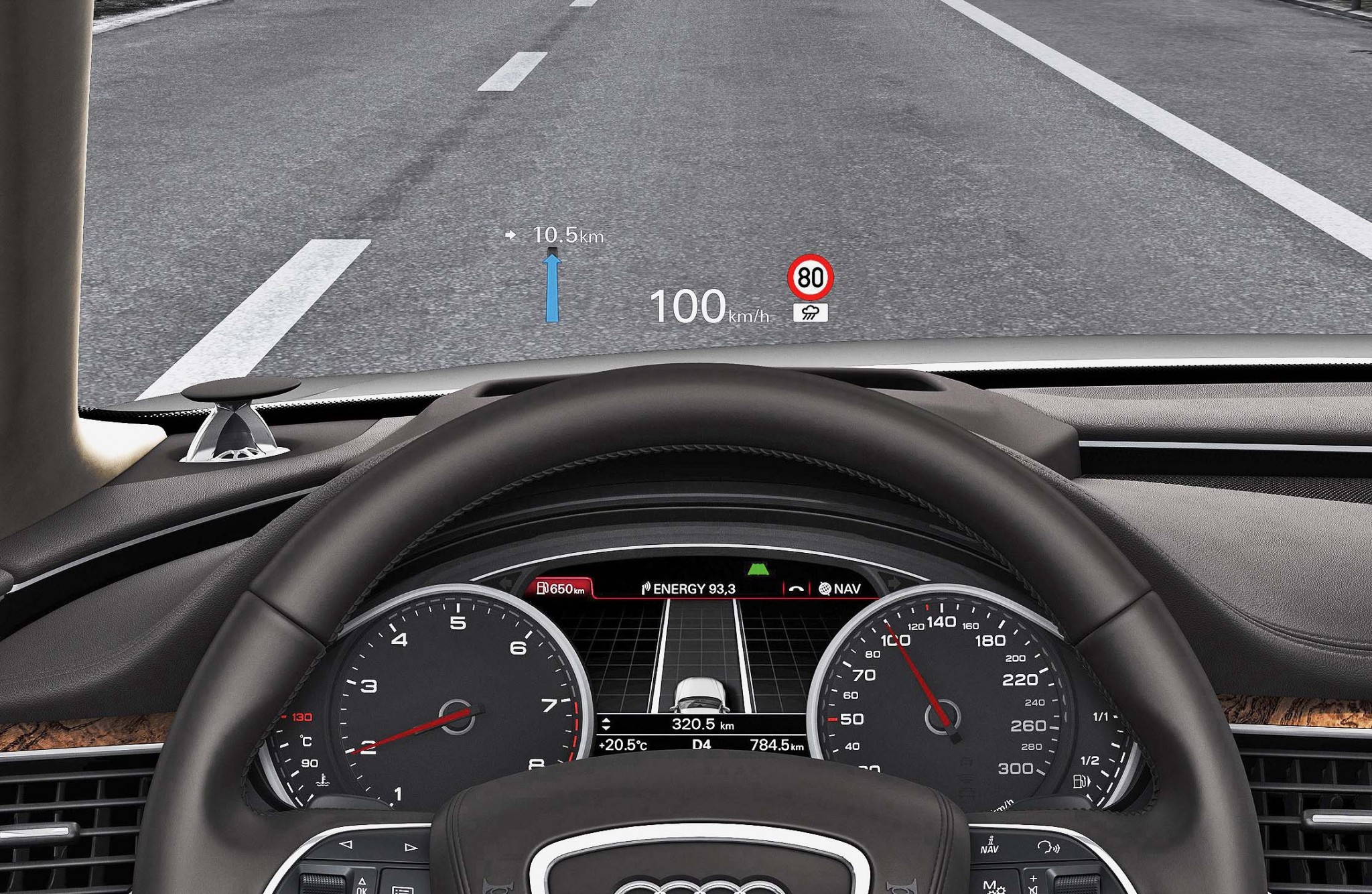 Изображение обрабатывается графическим процессором для максимальной четкости и через систему диодов, зеркал и линз выводится на цветной TFT-дисплей, откуда проецируется на ветровое стекло. При этом водитель видит отображаемые данные в перспективе, то есть на небольшом удалении от себя, что позволяет глазам не менять точку фокусировки. Картинку можно настроить в соответствии с ростом и посадкой сидящего за рулем. Помимо скорости автомобиля на проекционный дисплей альтернативно выводится информация о частоте вращения коленвала, актуальной радиостанции или проигрываемой мультимедийной системой композиции, дорожных знаках, равно как и навигационные указания. В будущем ветровое стекло превратится в некое подобие мегаэкрана дополненной реальности, способного, например, привлекать внимание к переходящему дорогу пешеходу.