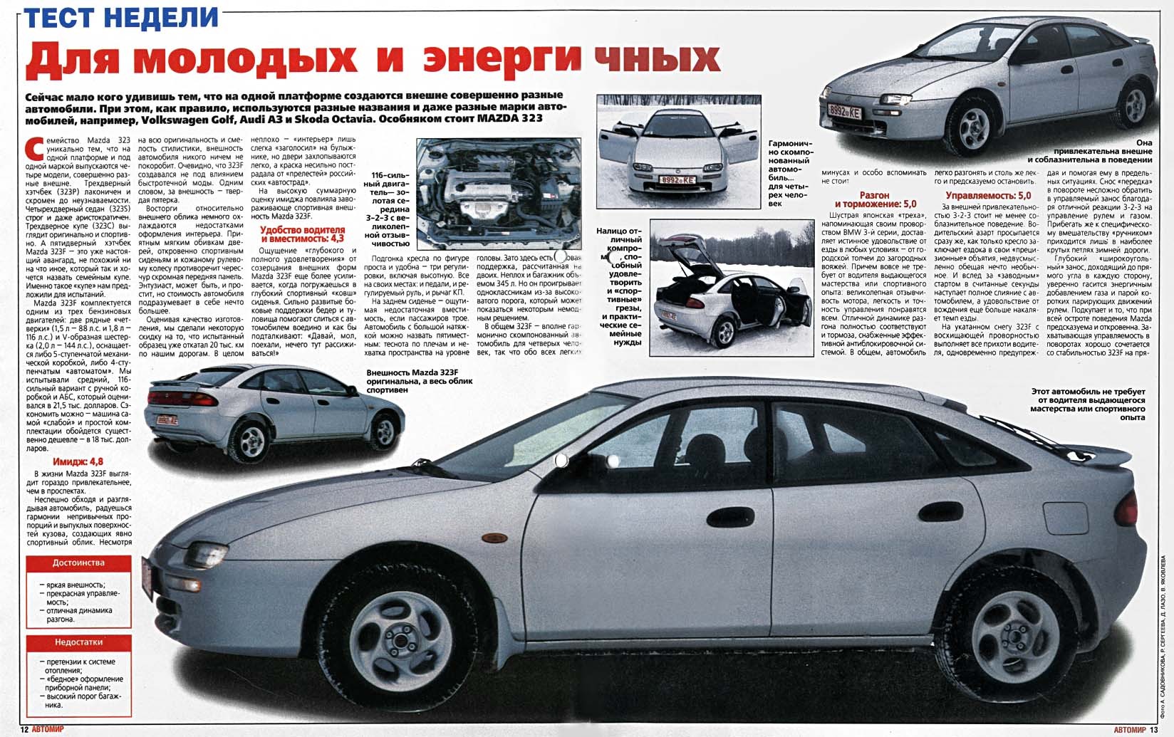 «Семейство Mazda 323 уникально тем, что на одной платформе выпускаются четыре модели, совершенно разные внешне. Трехдверный хэтчбек (323P) лаконичен и скромен до неузнаваемости. Четырехдверный седан (323S) строг и даже аристократичен. Трехдверное купе (323C) выглядит оригинально и спортивно. А пятидверный хэтчбек Mazda 323F – настоящий авангард, не похожий ни на что иное, который так и хочется назвать семейным купе».