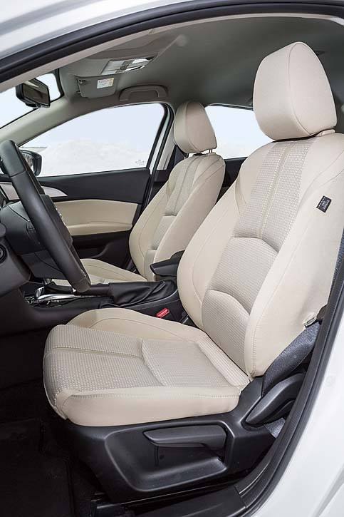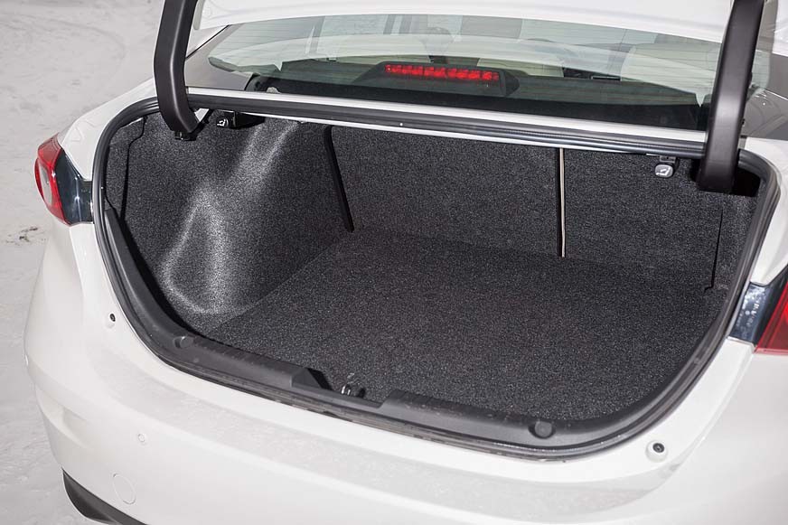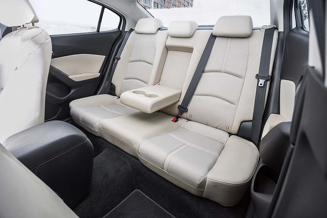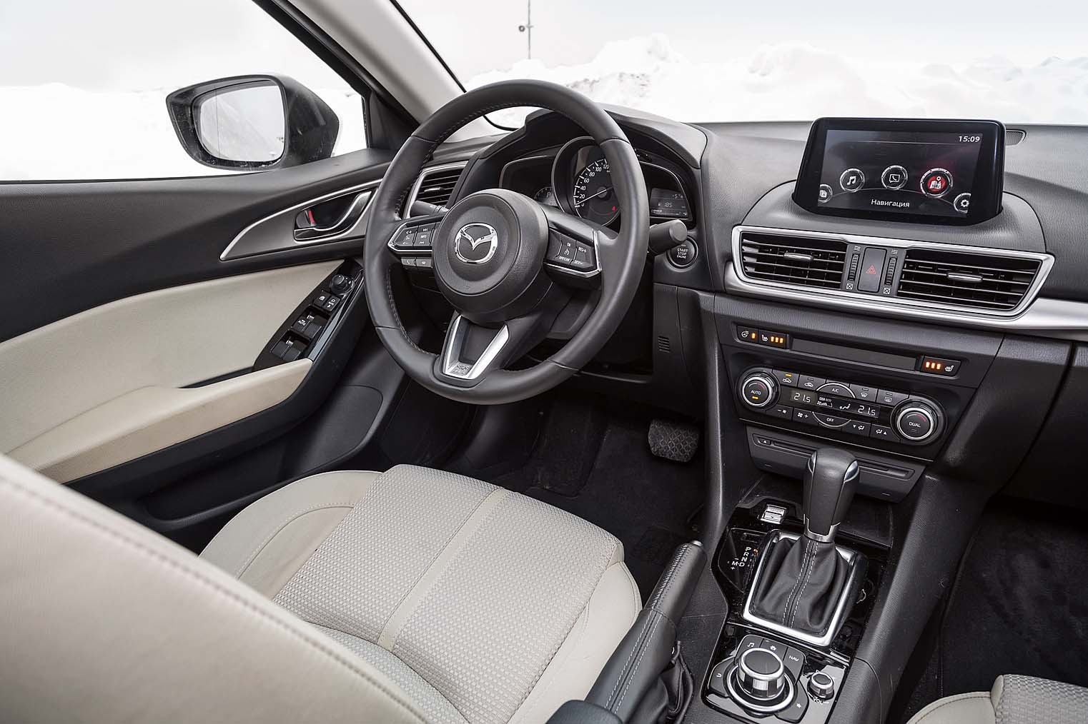 Отличие топ-версии от младшей Active+ в наличии светодиодных фар и ходовых огней, датчиков света и дождя, подогрева руля и круиз-контроля, а также камеры заднего вида и парктроника – базовой «трешке» эти полезные приспособления не положены. Бежевый цвет обивки сидений и панелей дверей визуально освежают интерьер. Компоновка вполне удачна, но на особый простор в Mazda3 рассчитывать не приходится. На заднем диване при желании можно сносно устроиться и втроем, однако среднего пассажира стесняет высокий центральный тоннель.