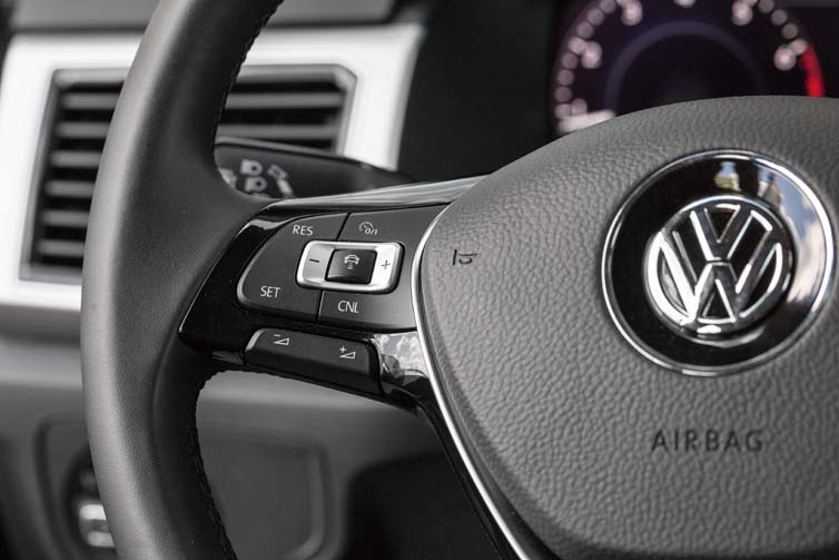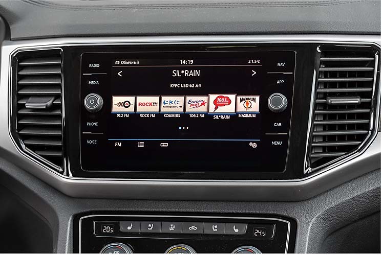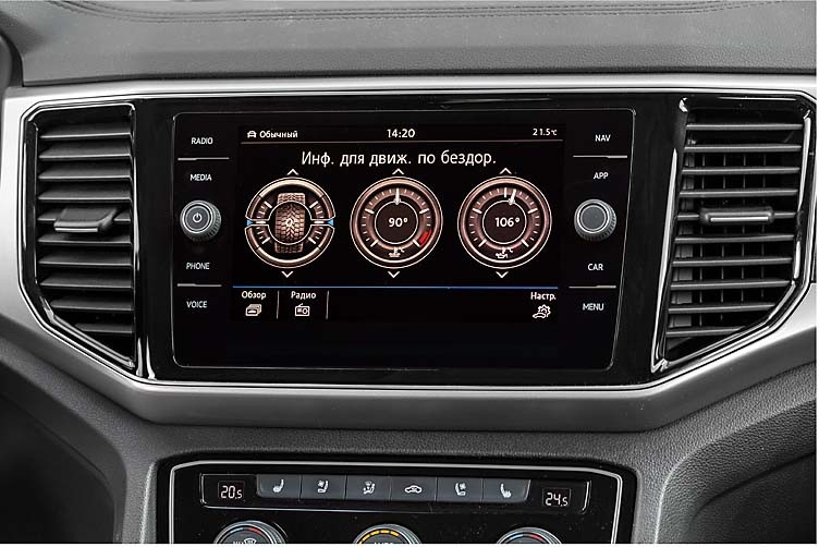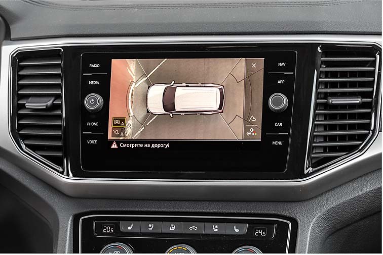У российской версии нет пневмобаллонов в подвеске – только пружины. В трансмиссии применяется 8-ступенчатый классический автомат. Тем, кто с подозрением относится к турбомоторам, в качестве альтернативы предлагается 280-сильный атмосферный V6. Но и возможностей наддувной 2,0-литровой «четверки» достаточно для успешного перемещения на Teramont на городских улицах и загородных магистралях, хоть визуально она и «теряется» в недрах подкапотного пространства. В разгоне до «сотни» Teramont c TSI даже быстрее атмосферного. Двухтонный кроссовер резво стартует и уверенно набирает ход – только успевай следить за показаниями спидометра на «виртуальной» приборной панели. Подспорье в дальней дороге – адаптивный круиз-контроль с функцией удержания полосы. Работает исправно, но все-таки излишне нервно на «черепашьих» скоростях в глухой пробке – в таких условиях то и дело приходится брать управление на себя. Выручает в ограниченном пространстве и функция панорамного обзора – изображение с камер на центральном экране медиасистемы весьма наглядно.
