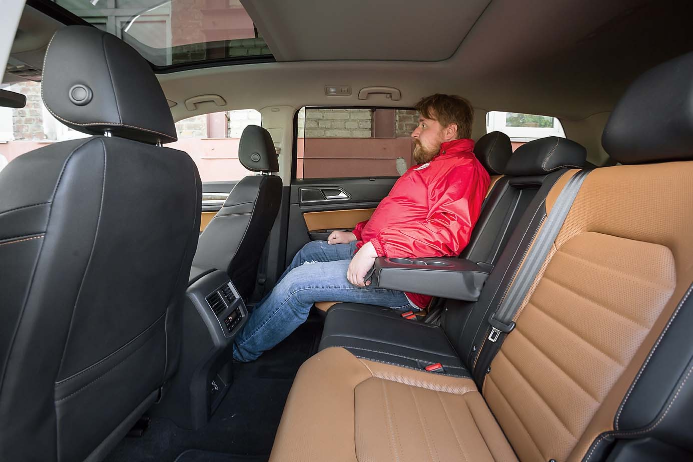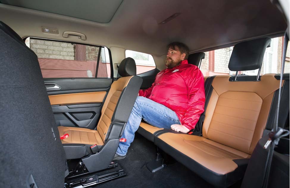 От своих дальних родственников Teramont и вправду ушел очень далеко: более 5 метров в длину и семь полноценных мест. Даже на «галерке» смогут с относительным комфортом разместиться и преодолеть пару сотен километров два взрослых человека. Завязывать ноги в узел не потребуется – можно лишь слегка сдвинуть вперед задний диван. Те, кто, в свою очередь, разместятся на нем, обидеться не должны. Запас пространства – как в представительском седане. И попасть на третий ряд относительно просто. За океаном вообще можно заказать шестиместную версию с раздельными креслами вместо заднего дивана, но и в семиместной конфигурации все просто. Секции дивана откидываются вперед и перемещаются по направляющим практически вплотную к переднему сиденью. Разумеется, их можно сдвигать по отдельности, а также регулировать наклон спинки. Сервоприводов нет, все делается вручную, но очень легко – каких-либо сверхъестественных усилий прилагать не требуется. Аналогично и с двухместным задним диванчиком: его можно разложить и сложить и из салона, и из багажника – потянув за специальные ремни, управляющие защелками. Широк простор и для грузоперевозок: если сложить второй и третий ряд, образуется ровный пол. По краям отсека – металлические петли для фиксации груза.