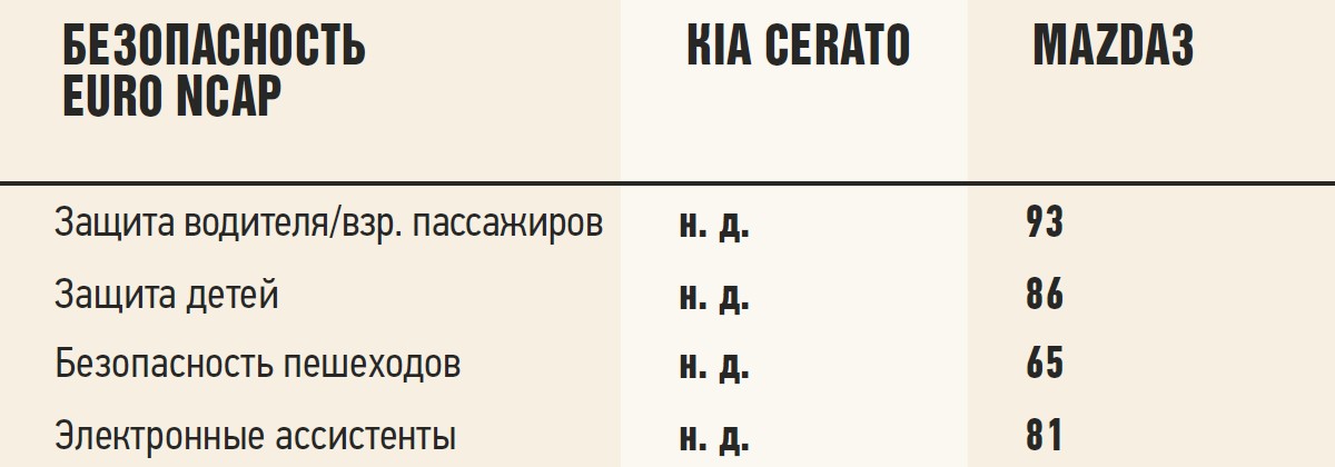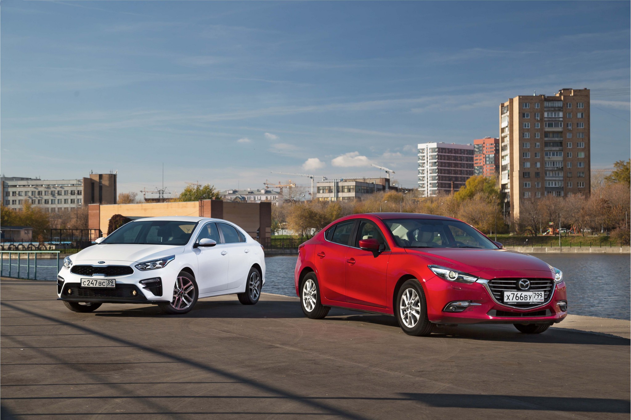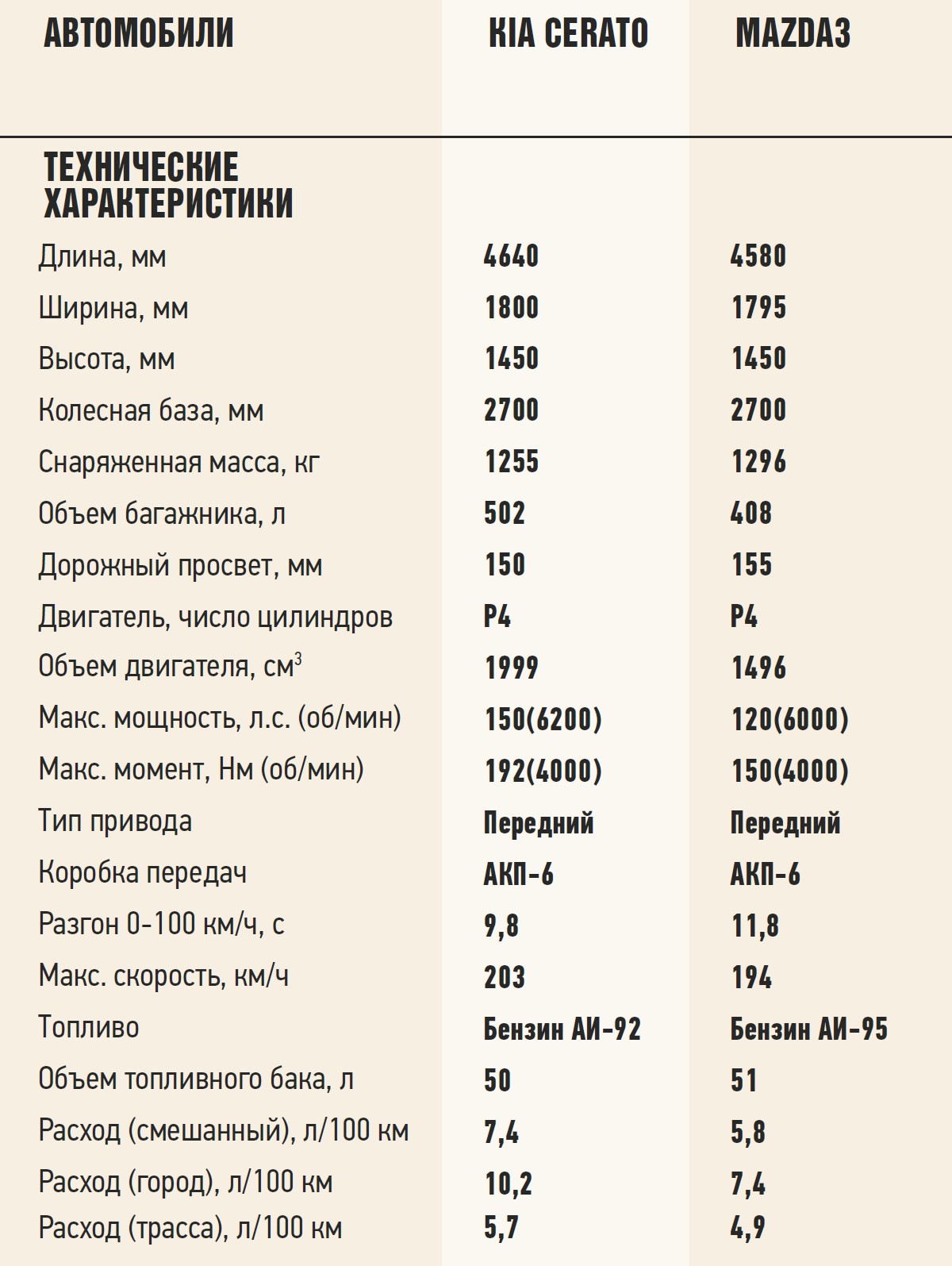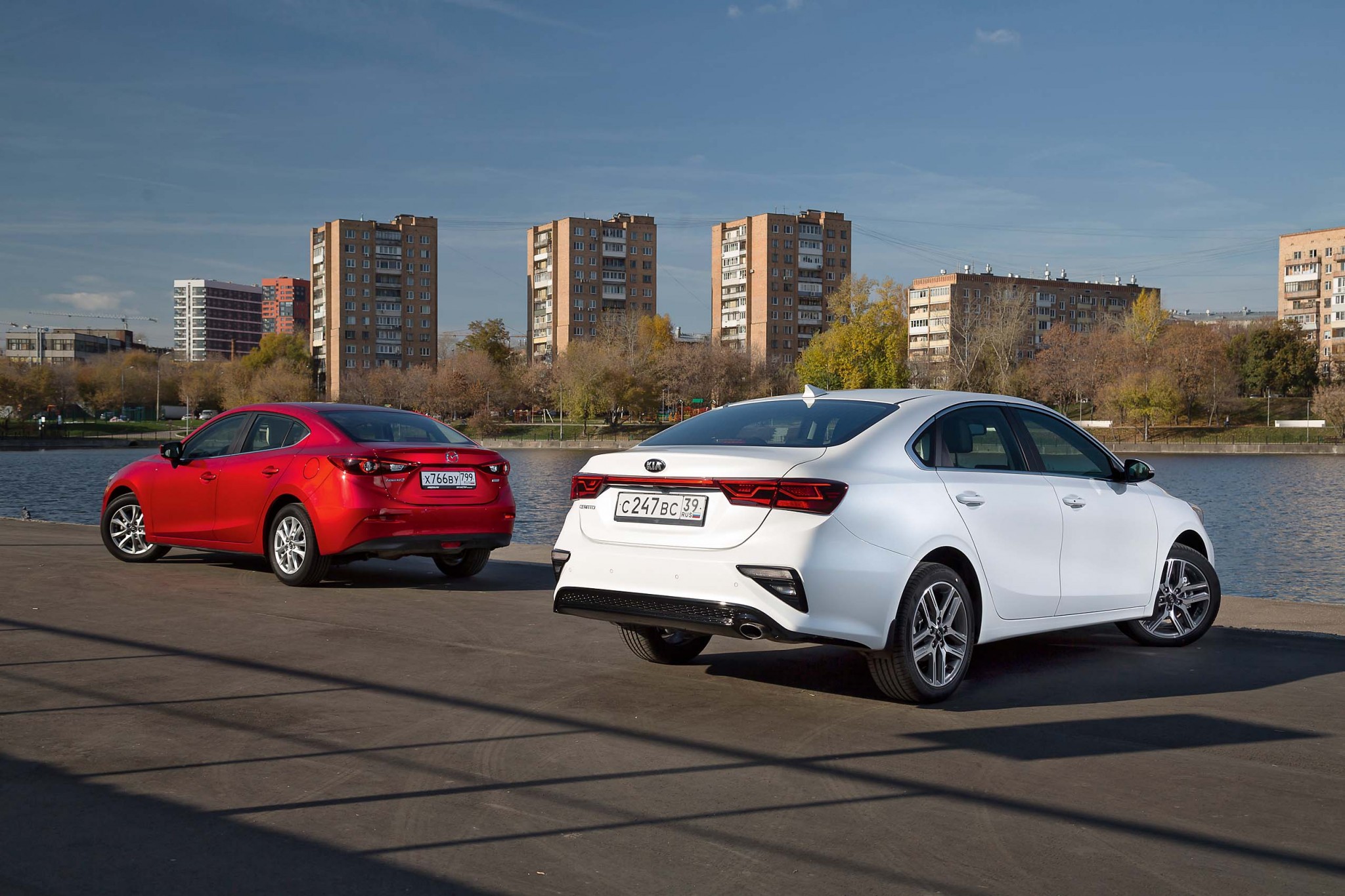 Последнее замечание распространяется и на пассажиров. Конечно, о просторах седанов бизнес-класса говорить не приходится, но для двоих взрослых на диване Kia места вполне достаточно. Справедливости ради стоит заметить, что у задних пассажиров «Мазды» места над головой на сантиметр больше, но доступный в Сerato обогрев сидений им не положен. Результат сравнения багажников можно назвать ничейным. В японской машине грузовой отсек скромнее по объему, но обустроен чуть лучше.