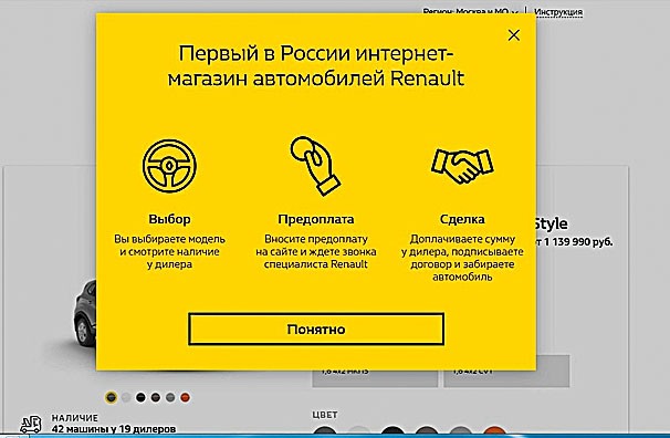 «Для заказа автомобиля необходимо совершить три шага: выбрать комплектацию модели, выбрать дилера на интерактивной карте и внести предоплату с помощью банковской карты», гласит инструкция на сайте французского бренда. Договор купли-продажи автомобиля оформляется и подписывается в дилерском центре. В качестве бонуса для Интернет-покупателей Renault предлагает сниженные цены и, по возможности, более короткий срок ожидания поставки.