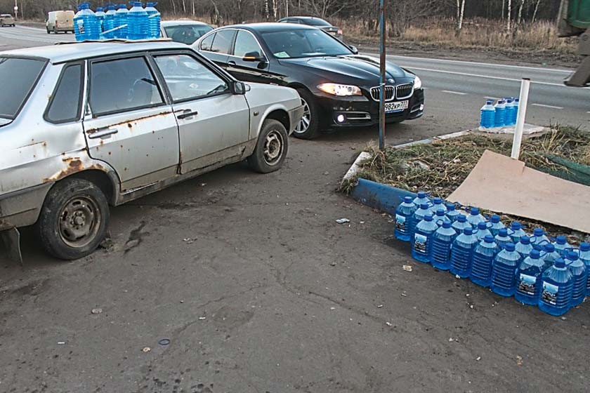 Каждый раз с наступлением холодов в России можно наблюдать интересную картину: как грибы после дождя вдоль обочин дорог возникают импровизированные точки продажи стеклоомывающей жидкости. Как правило, выглядят они следующим образом: пирамидка из канистр, яркая подсветка и припаркованный автомобиль – в нем продавец. Почему такие точки существуют, понятно: каждую зиму на российские дороги выливают тонны реагентов, из-за чего водители тратят омывающую жидкость чуть ли не в промышленных масштабах. А раз есть спрос, будет и предложение! Поэтому торговцы встают на самом «рыбном» месте – вдоль трасс. Вот только где они берут такое количество незамерзайки?