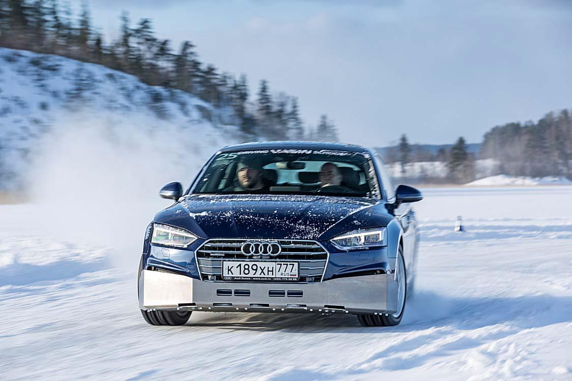 А еще в Vasin Driving School появилось четырехдверное купе Audi A5 – на нем проходили заезды на время среди «выпускников» зимней школы вождения. Автомобиль, правда, доработали – установили специально изготовленный фартук на передний бампер. Ведь снег по краям трассы превращается в плотный лед – достаточно один раз вылететь и с заводским бампером можно попрощаться.