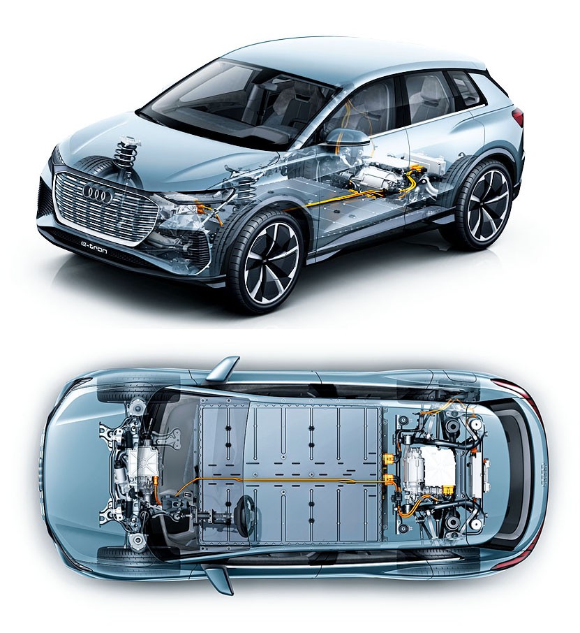 Audi Q4 e-tron получил два электромотора – по одному на каждую ось. Суммарная мощность силовой установки – 306 л.с. Разгон до 100 км/ч кроссовер способен совершить всего за 6,3 с, а максимальная скорость ограничена электроникой на отметке 180 км/ч. Немецкий производитель обещает, что на одной зарядке автомобиль сможет преодолеть 450 км. Инженеры сделали все возможное, чтобы снизить лобовое сопротивление. Кроме того, кроссовер получил и «умную» систему рекуперации, позволяющую запасать энергию во время движения и торможений. Плоские аккумуляторные батареи занимают практически все пространство между осями Audi Q4 e-tron. Благодаря этому удалось сместить центр тяжести ближе к земле и добиться эталонной развесовки по осям 50:50.