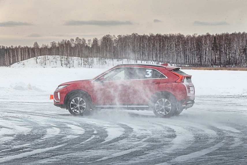 Начать с того, что отполированный лед оказался шипованным покрышкам Bridgestone Blizzak Spike 02 «не по зубам». Что стало очередным примером критической роли шин и ограниченных возможностей полного привода. Независимо от количества ведущих колес бороться с недостаточной поворачиваемостью можно лишь при небольшом переборе скорости и в основном за счет рулежки. А для того чтобы управлять машиной в повороте рулем и газом, нужен какой-никакой «зацеп». В нашем конкретном случае, чтобы зацепиться и пройти вираж, не вылетев за ограничивающие его конусы, скорость на входе не должна была превышать 30 км/ч. Однако темп – категория условная, в зависимости от радиуса виража он может быть выше или ниже, неизменно одно – из-за более тяжелого мотора V6, а, следовательно, и большей силы инерции, заставляющей автомобиль двигаться прямо, Outlander GT начинает поворачивать на меньшей скорости, чем Eclipse Cross.