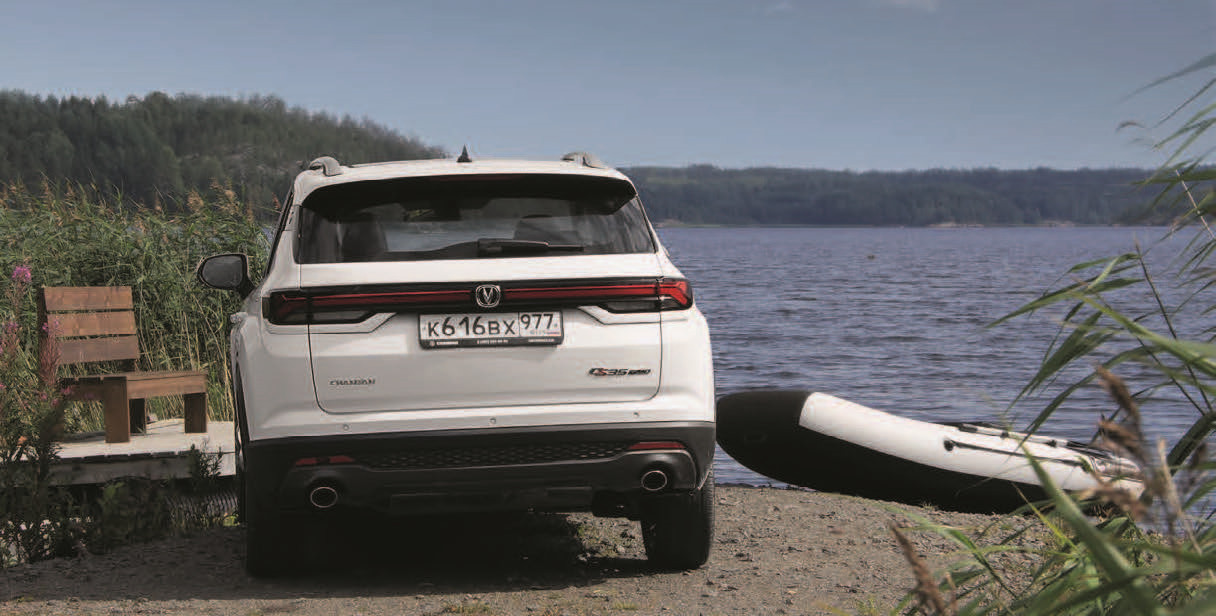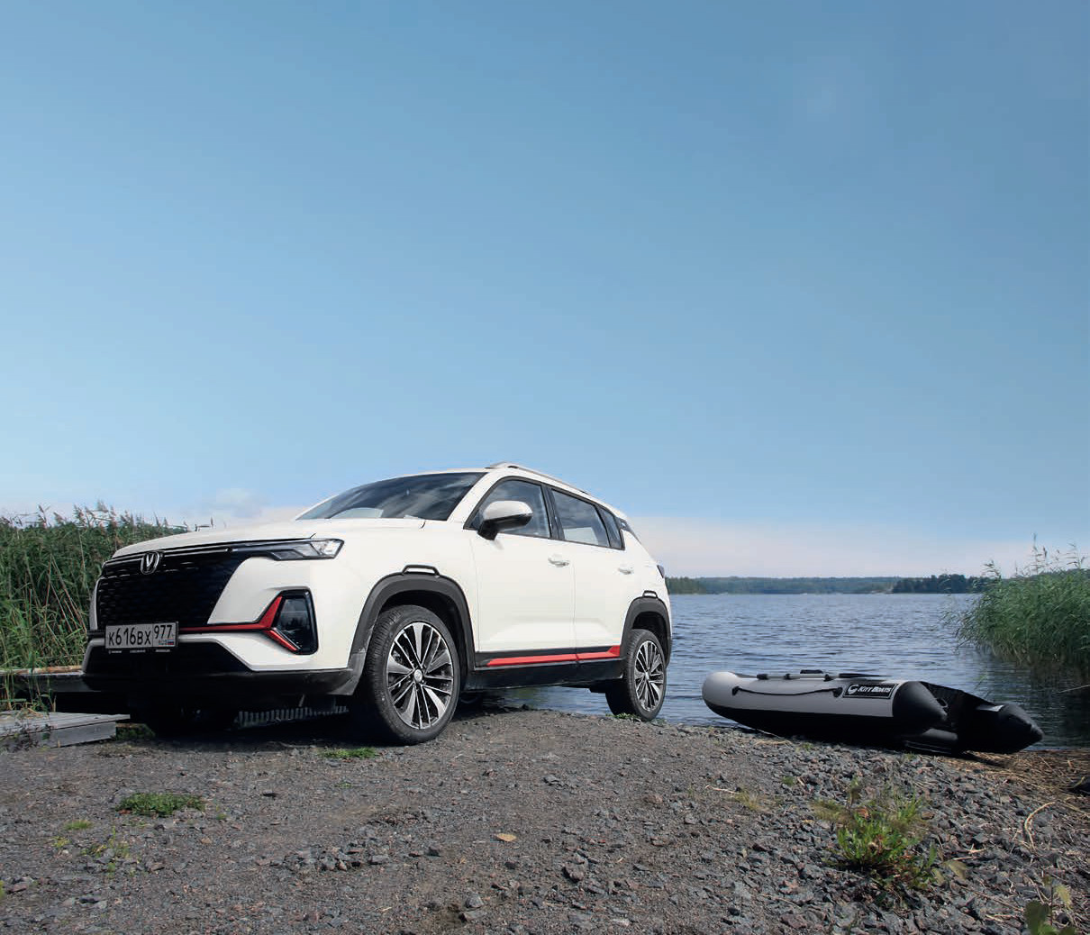 Признаться, я не встречал в промоматериалах китайской марки утверждений о том, что именно эта модель адресована любителям путешествий. Хотя она вполне могла бы так ее позиционировать. Тут есть огромная панорамная крыша, которую не всегда встретишь и в машинах подороже. Или вот такая деталь декора, как черная такая вставка над колесной аркой. Ну чем не ручка от чемодана? Или ручка на борту надувной лодки, сделанная для ее переноски. Впрочем, когда я вынул из багажника плавсредство и надул его, выяснилось, что общего у этих средств передвижения еще больше. И речь не только про красный орнамент на кузове, столь похожий на тот, чем украшают подвесные лодочные моторы.
