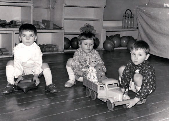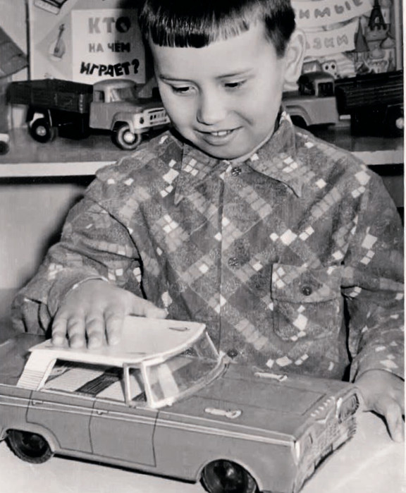 Грузовичок «Запорожец» в детском саду с куклой и мишкой в кузове. Колеса уже другие – вместо гладкого протектора поставлена вездеходная резина, совершенно не нужная на ровном полу. Мальчик слева сидит верхом на пластмассовом катере. Автомобили ЗИС-150 и ЗИС-151 стали прототипами для большинства игрушечных металлических грузовичков. Выпускали их не только на комбинате «Запорожсталь», но также на заводе «Ленигрушка» в Ленинграде, «Серп и молот» в Москве и других.Игрушечная легковая модель не имеет конкретного «настоящего» прототипа и больше похожа на что-то американское семидесятых годов. На заднем плане на полке видны два игрушечных ЗИЛ-130, но они уже пластмассовые. Фото также сделано в детском саду.Такая машинка, на которой надо было сидеть верхом и кататься, отталкиваясь ногами, так и называлась – «толкалка». А по технологии производства – «дутыш», поскольку пластиковая форма выдувалась целиком, а не штамповалась.