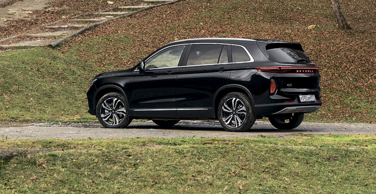 Встречаем по аккуратной и ладной одежке. Сообщается, что в процессе работы над обликом принимал участие дизайнер Джейсон Кларк Хилл, за плечами у которого практика в Mercedes-Benz и Porsche. Итого на вид Skywell – по размерам сопоставимый с моделями Mitsubishi Outlander или Skoda Kodiaq – гармоничный, сдержанный, приятный. Внезапно есть фактически бесполезная у электрокара, зато привычная глазу радиаторная решетка. И нет никаких элементов, кричащих об электрической сущности. Топ-версия оснащается лазерными фарами, по умолчанию стоят 19-дюймовые колеса – круто.