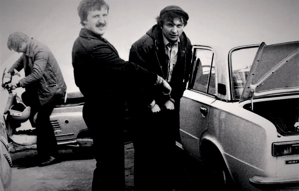Человек в кепке на переднем плане накачивает колесо своих «Жигулей». Ногами прижимает к асфальту опорную планку штатного автомобильного насоса, руки лежат на рукоятках. Судя по одежде героев, это рубеж 1970–1980-х. Удобный ножной насос пока еще редкость, про электрические компрессоры с питанием от бортовой розетки и говорить нечего. Поэтому каждый ход штока вниз – низкий поклон своим «Жигулям»-«копейке», советской версии Fiat 124. А в их лице – западным автомобильным технологиям, перенесенным на нашу почву.