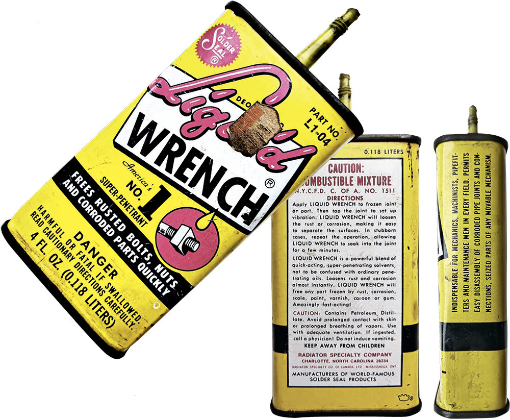 Разработанный в 1953 году в США WD-40 известен сегодня больше других, но четырьмя годами позже появилась Liquid Wrench, в переводе буквально – «жидкий ключ», проникающий агент № 1 в Америке, как написано на красивой красно-желтой баночке – к примеру, вот такой, как на фото, в совсем небольшой расфасовке, четыре унции, сто восемнадцать миллилитров. К слову, сегодня за такую винтажную тару, уже без содержимого, на международном интернет-аукционе просят долларов от 8 до 12 – дух времени, аутентичный дизайн 1950-х.