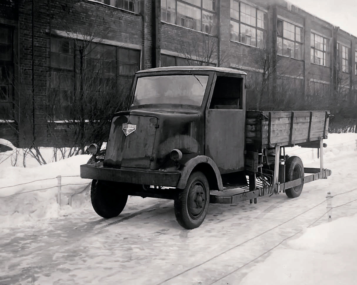 Грузовой электромобиль Bleichert, переоборудованный в ВЧмобиль на опытном высокочастотном участке, проложенном между корпусами НАМИ. Очевидно, это первый вариант сети с проводкой в виде кабелей на фарфоровых изоляторах.