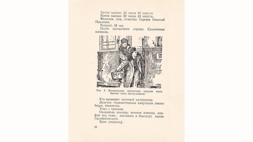 Да, несчастные случаи в СССР есть, но их виновниками часто бывают сами пострадавшие. Далее следует разбор отдельных, как говорят сегодня, кейсов. «Сергеев Николай Павлович. 38 лет. Место несчастного случая: Самотечная площадь. Диагноз: травматическая ампутация левого бедра, опьянение. Упал с трамвая». Автор задается вопросом: «Какая жизненная драма кроется за этими сухими протокольными строками?» И рассказывает, что произошло с отцом двоих детей, бухгалтером издательства. «В 6 часов вечера по окончании работы Николай Павлович с приятелем, счетоводом того же издательства, зашли в пивной зал. Посидели с часок и выпили полдюжины бутылок пива…» После бара герой повествования, «слегка пошатываясь, пошел по магазинам». Потом пытается сесть в переполненный трамвай – «трезвый человек сразу бы сообразил, что в этот вагон, да еще с покупками, сесть не удастся». В итоге не удержался на подножке. «Сергеев, конечно, будет еще работать. Бухгалтер может работать и без ноги. О нем позаботится и администрация, и местком, и отдел социального обеспечения. Но ничто не исправит случившегося с ним».