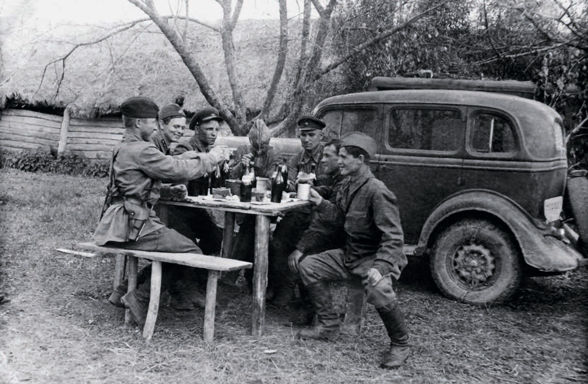 Фотокарточка военных лет, о чем сообщает подпись на обратной стороне: «На память Ане в день твоего рождения подымаю бокал за твою дальнейшую счастливую жизнь. Митя. Лиховищи, 24.5.42 года». В роли бокалов здесь, правда, более суровые алюминиевые кружки, а пьют красноармейцы банальное «Жигулевское». Судя по знакам на петлицах, это артиллеристы. Автомобиль на заднем плане – ГАЗ-М1. Или, как его звали шоферы, «Эмка». Деревня с названием Лиховищи в России только одна и находится в Белевском районе Тульской области. Весной 1942 года там только что закончились ожесточенные бои в рамках Болховской операции, когда линия фронта проходила всего в 10 км от Белева.