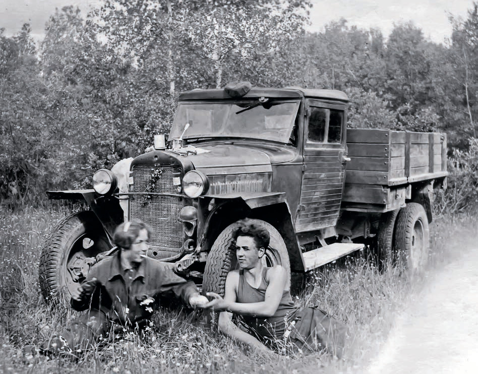 Разложить газетку и «накрыть стол» на плоском капоте современной машины будет намного удобнее, чем на многих старинных автомобилях, где капоты узкие, покатые, выпуклые и округлые – в общем, любой формы, которая далека от столешницы. И за это многие любители трапез на капоте должны быть благодарны веяниям автомобильного дизайна! Иначе было бы как здесь, когда на капот «полуторки» ГАЗ-ММ можно поставить только две банки тушенки и положить нарезанный хлеб. Зато пустые бутылки из-под водки «Московская» можно запихнуть за бугель – так называется перемычка между крыльями, на которой крепятся фары. Карточка подписана: «Лето 1944 года, деревня Жирошкино». Это в Подмосковье, Раменский район.