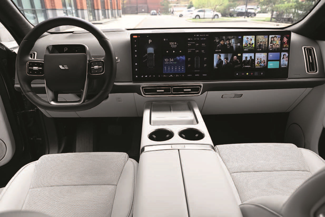 Подходишь к машине – щелкают замки, выезжают подножки, раскрываются зеркала, выскакивают дверные ручки. Садишься за руль, и сразу интересно: а где панель приборов? Ни аналоговой, ни цифровой – только экран в верхней части рулевой колонки, он вращается вместе с рулевым колесом, на него выведены данные маршрутного компьютера. Все остальное – на изнанке лобового стекла, где HUD-проекция с диагональю 13,35 дюйма. Туда выводятся не только цифры скорости и служебные символы – Li L9 Max показывает водителю в режиме дополненной реальности, что происходит вокруг на дороге: вот двигаются соседи по потоку, вот идут по тротуарам пешеходы, даже сигналы светофора видны, можно ехать буквально по приборам.