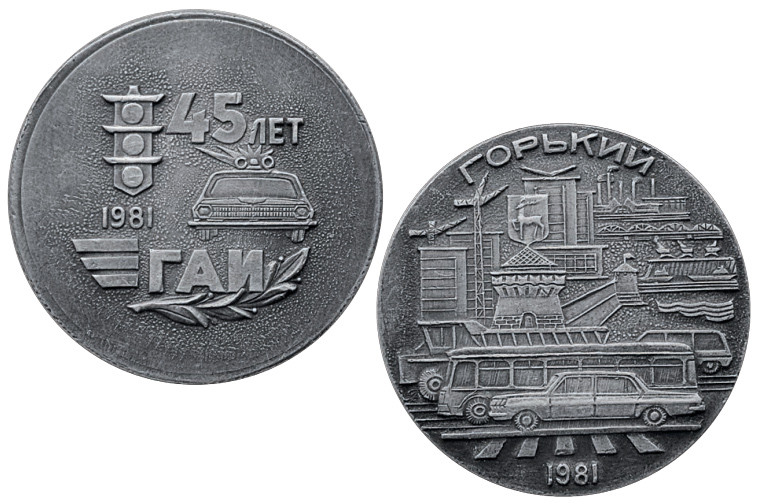 С первого взгляда этот артефакт из советского прошлого выглядит довольно странно и нелепо. На одной стороне – милицейская «Волга» и надпись о 45-летнем юбилее ГАИ в 1981 году, а на другой – город Горький и та же дата. Но на самом деле здесь много общего.