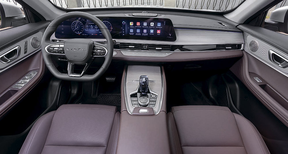 Салон из экокожи темно-коричневого цвета дополнен серыми матовыми вставками в передней панели и дверных картах. На передней панели появился двойной изогнутый экран 2×12,3 дюйма, объединивший панель приборов и комплекс системы мультимедиа. Компоновка центральной консоли стала более функциональной и интуитивно понятной. Эргономичный рычаг «робота» позволяет управлять коробкой передач буквально двумя пальцами. А в его граненую рукоятку из прозрачного пластика интегрировано изображение тигра – символа Tiggo.
