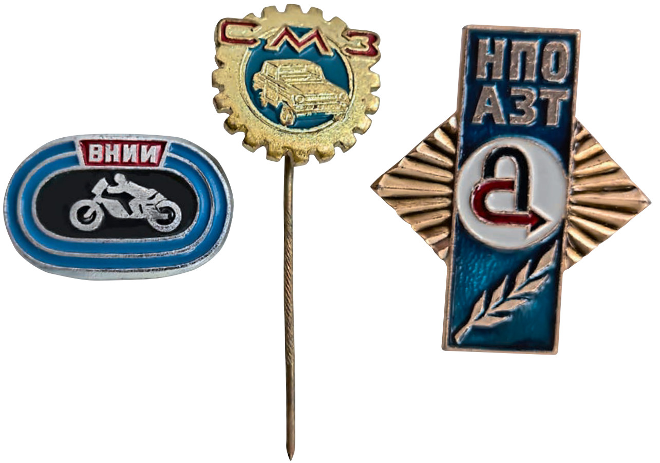 Наша сегодняшняя коллекция напоминает немного об ином. Все эти три значка выпущены в честь предприятий в подмосковном городе Серпухове. Все они в той или иной степени имеют отношение к автомобилям. И никому из них не удалось дожить до сегодняшнего дня. ВНИИ мотопром ведет свою историю с 1942 года, когда