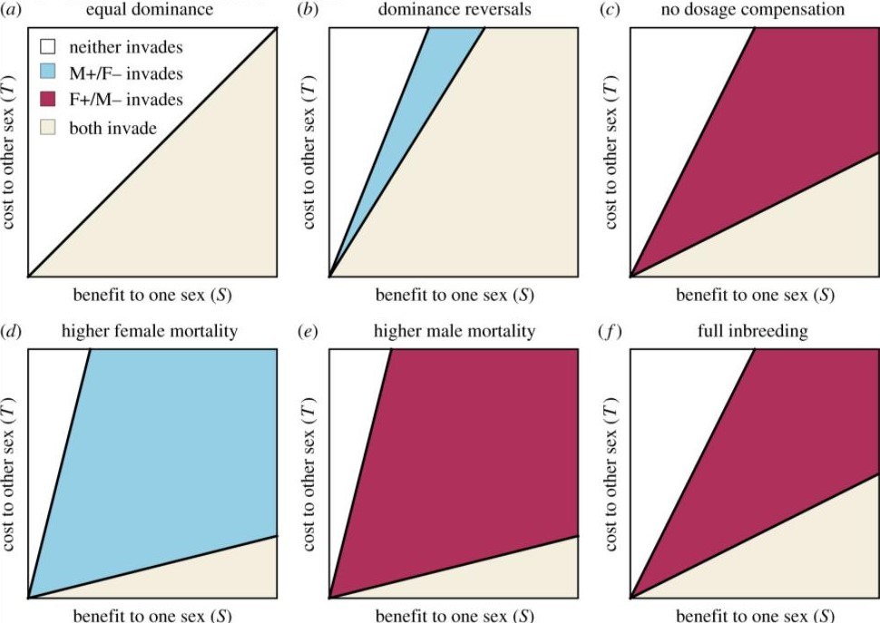 Биологи Томас Хичкок (Thomas Hitchcock) и Энди Гарднер (Andy Gardner) из Сент-Эндрюсского университета проанализировали внутригеномный конфликт с точки зрения отельных генов, а не всего генома. Они обозначили выгоду, которую мутантный аллель приносит одному полу в гомозиготной или гемизиготной форме (когда обе парные хромосомы несут этот аллель или в геноме есть только одна копия хромосомы), за S, а снижение приспособленности для другого пола за T. Если хромосома у рассматриваемого пола парная (как все аутосомы и X-хромосома у самок), то мутация в одной из них принесет выгоду